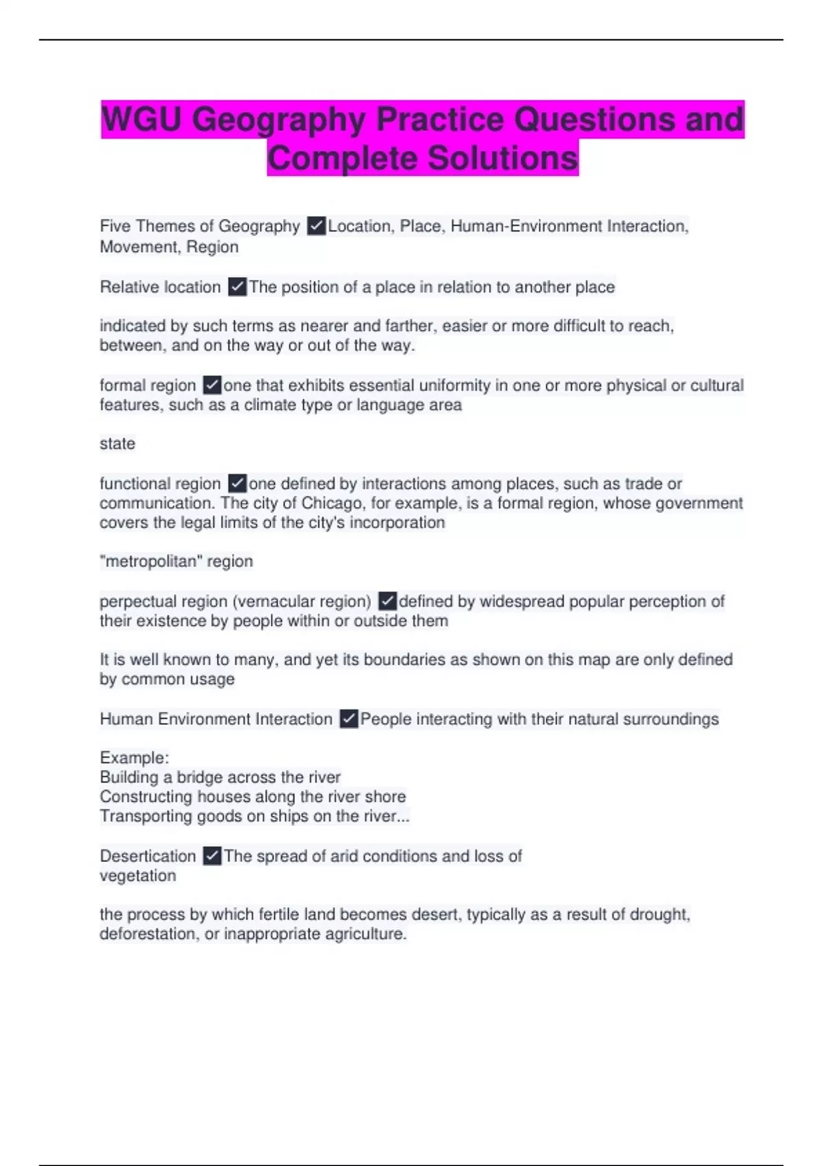 Five Themes of Geography Location, Place, Human-Environment Interaction, Movement, Region Relative location The position of a place in relation to another place indicated by such terms as nearer and farther, easier or more difficult to reach, between, and on the way or out of the way. formal region one that exhibits essential uniformity in one or more physical or cultural features, such as a climate type or language area state functional region one defined by interactions among places, such as trade or communication. The city of Chicago, for example, is a formal region, whose government covers the legal limits of the city's incorporation "metropolitan" region perpectual region (vernacular region) defined by widespread popular perception of their existence by people within or outside them It is well known to many, and yet its boundaries as shown on this map are only defined by common usage Human Environment Interaction People interacting with their natural surroundings Example: Building a bridge across the river Constructing houses along the river shore Transporting goods on ships on the river...