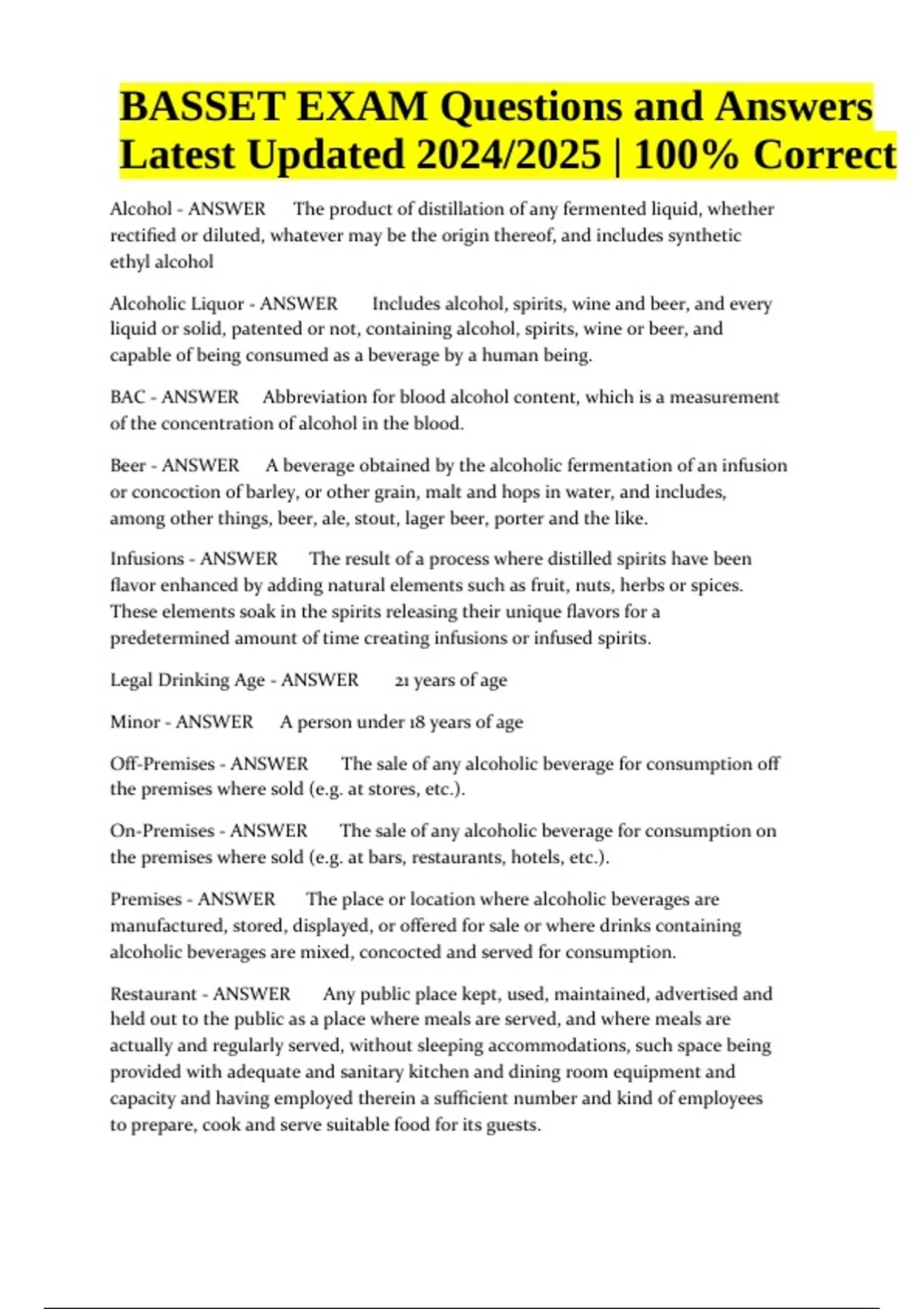 BASSET EXAM Questions and Answers Latest Updated 2024/2025 (100% Correct) Alcohol - ANSWER The product of distillation of any fermented liquid, whether rectified or diluted, whatever may be the origin thereof, and includes synthetic ethyl alcohol Alcoholic Liquor - ANSWER Includes alcohol, spirits, wine and beer, and every liquid or solid, patented or not, containing alcohol, spirits, wine or beer, and capable of being consumed as a beverage by a human being. BAC - ANSWER Abbreviation for blood alcohol content, which is a measurement of the concentration of alcohol in the blood. Beer - ANSWER A beverage obtained by the alcoholic fermentation of an infusion or concoction of barley, or other grain, malt and hops in water, and includes, among other things, beer, ale, stout, lager beer, porter and the like. Infusions - ANSWER The result of a process where distilled spirits have been flavor enhanced by adding natural elements such as fruit, nuts, herbs or spices. These elements soak in the spirits releasing their unique flavors for a predetermined amount of time creating infusions or infused spirits. Legal Drinking Age - ANSWER 21 years of age Minor - ANSWER A person under 18 years of age Off-Premises - ANSWER The sale of any alcoholic beverage for consumption off the premises where sold (e.g. at stores, etc.). On-Premises - ANSWER The sale of any alcoholic beverage for consumption on the premises where sold (e.g. at bars, restaurants, hotels, etc.). Premises - ANSWER The place or location where alcoholic beverages are manufactured, stored, displayed, or offered for sale or where drinks containing alcoholic beverages are mixed, concocted and served for consumption. Restaurant - ANSWER Any public place kept, used, maintained, advertised and held out to the public as a place where meals are served, and where meals are actually and regularly served, without sleeping accommodations, such space being provided with adequate and sanitary kitchen and dining room equipment and capacity and having employed therein a sufficient number and kind of employees to prepare, cook and serve suitable food for its guests. BASSET EXAM Questions and Answers Latest Updated 2024/2025 | 100% Correct Retailer - ANSWER A person who sells, or offers for sale, alcoholic liquor for use or consumption and not for resale in any form. Spirits - ANSWER Any beverage which contains alcohol obtained by distillation, mixed with water or other substance in solution, and includes brandy, rum, whiskey, gin, or other spirituous liquors, and such liquors when rectified, blended or otherwise mixed with alcohol or other substances. Underage Person - ANSWER A person who is not of legal drinking age; i.e., a person who is under 21 years of age. Wine - ANSWER Any alcoholic beverage obtained by the fermentation of the natural contents of fruits, or vegetables, containing sugar, including such beverages when fortified by the addition of alcohol or spirits. Alcohol is not - ANSWER a stimulant Alcohol acts as - ANSWER a sedative on the sensory and motor systems, dulling normal reactions and altering a person's behavior. Alcohol is a - ANSWER depressant drug that directly affects the entire nervous system. How much alcohol is absorbed by the stomach - ANSWER 20% How much alcohol is absorbed into the bloodstream - ANSWER 75-80% What is the average time it takes for an alcoholic drink to be completely absorbed into the bloodstream? - ANSWER 45-90 minutes Alcohol acts as a depressant on the nervous system and affects the areas of the brain in this order - ANSWER 1. Cortex: Judgement 2. Cerebellum: Coordination 3. Limbic System: Emotion 4. Brain Stem: Respiratory System Is Alcohol Poisoning a drug overdose? - ANSWER Yes What two ways is alcohol removed from the body? - ANSWER Metabolism: through the liver Excretion: breathing, perspiration, urine How quickly does the body eliminate alcohol? - ANSWER A healthy body eliminates about one standard drink per hour What does BAC 0.10% mean? - ANSWER 1 part alcohol per 1,000 parts of blood Standard serving for beer - ANSWER 12 oz Standard serving for wine - ANSWER 5 oz standard serving for 80 proof spirits - ANSWER 1.25 oz standard serving for 100 proof spirits - ANSWER 1 oz What is one effect alcohol can have on a person if taken with certain drugs? - ANSWER Alcohol can reduce the effect certain drugs have on a person. True or False: Drivers age 21 and over are considered to be driving under the influence with a BAC of .08 or above - ANSWER true What are some factors that affect a person's BAC? - ANSWER Amount of alcohol, Time spent consuming alcohol, Food, Age, Health What are the limits for driving under the influence in IL? - ANSWER Under 21: 0.01 School Bus Drivers: 0.01 Commercial License: 0.04 21 and above: 0.08 According to the principle of basic equivalency, a standard serving go wine is? - ANSWER 5 ounces A person's ability to perform the skills required for driving is often affected by BAC levels that are _______. - ANSWER well below a BAC of 0.08 True or False: As long as a person eats food while he/she is drinking, he/she will not become intoxicated - ANSWER False Alcohol is a depressant drug that directly affects the ... - ANSWER entire nervous system What are some of the predictable effects alcohol has on driving ability? - ANSWER 0.08 BAC: Impaired perception, reduced information processing capability and short term memory loss. 0.10 BAC: Reduced ability to maintain lane position and brake appropriately. How does alcohol affect the brain? - ANSWER The depressant effects of alcohol begin with thinking skills and as more alcohol is consumed the alcohol affects coordination and motor skills. Large amounts of alcohol affect core functions of the nervous system including breathing. The liver ______ approximately 1 standard drink per hour - ANSWER metabolizes or eliminates At a BAC of 0.05 what are the predictable effects on driving? - ANSWER Reduced coordination, Reduced ability to track moving o