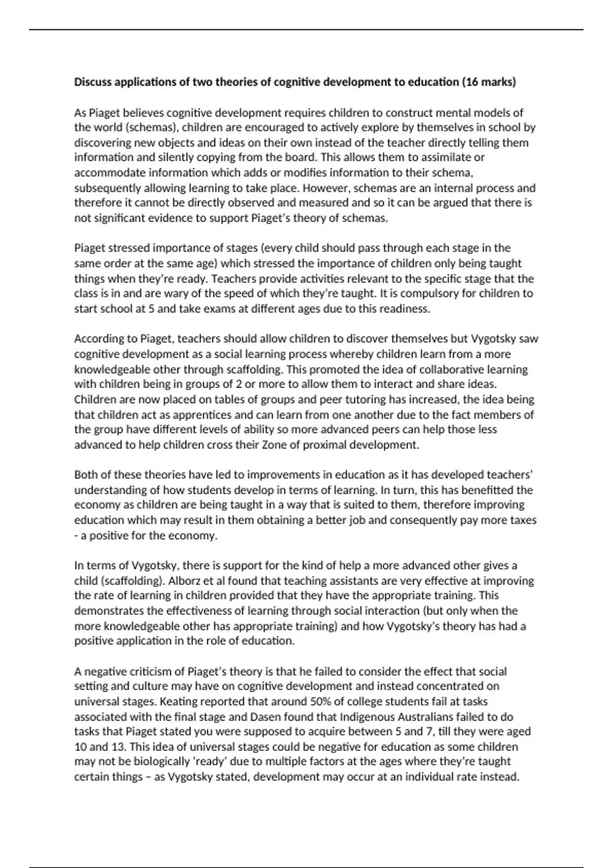 Discuss applications of two theories of cognitive development to education (16 marks)