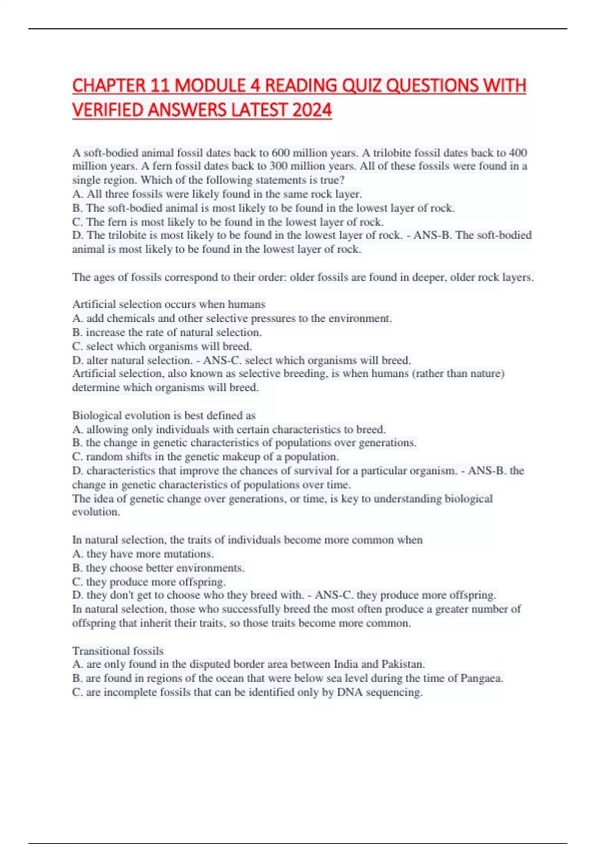 CHAPTER 11 MODULE 4 READING QUIZ QUESTIONS WITH VERIFIED ANSWERS LATEST 2024 A soft-bodied animal fossil dates back to 600 million years. A trilobite fossil dates back to 400 million years. A fern fossil dates back to 300 million years. All of these fossils were found in a single region. Which of the following statements is true? A. All three fossils were likely found in the same rock layer. B. The soft-bodied animal is most likely to be found in the lowest layer of rock. C. The fern is most likely to be found in the lowest layer of rock. D. The trilobite is most likely to be found in the lowest layer of rock. - ANS-B. The soft-bodied animal is most likely to be found in the lowest layer of rock. The ages of fossils correspond to their order: older fossils are found in deeper, older rock layers. Artificial selection occurs when humans A. add chemicals and other selective pressures to the environment. B. increase the rate of natural selection. C. select which organisms will breed. D. alter natural selection. - ANS-C. select which organisms will breed. Artificial selection, also known as selective breeding, is when humans (rather than nature) determine which organisms will breed. Biological evolution is best defined as A. allowing only individuals with certain characteristics to breed. B. the change in genetic characteristics of populations over generations. C. random shifts in the genetic makeup of a population. D. characteristics that improve the chances of survival for a particular organism. - ANS-B. the change in genetic characteristics of populations over time. The idea of genetic change over generations, or time, is key to understanding biological evolution. In natural selection, the traits of individuals become more common when A. they have more mutations. B. they choose better environments. C. they produce more offspring. D. they don't get to choose who they breed with. - ANS-C. they produce more offspring. In natural selection, those who successfully breed the most often produce a greater number of offspring that inherit their traits, so those traits become more common. Transitional fossils A. are only found in the disputed border area between India and Pakistan. B. are found in regions of the o