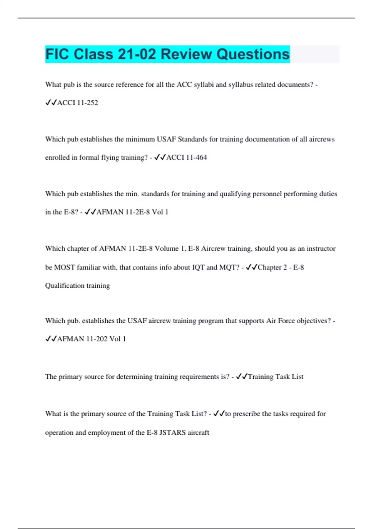 FIC Class 21-02 Review Questions What pub is the source reference for all the ACC syllabi and syllabus related documents? - ACCI 11-252 Which pub establishes the minimum USAF Standards for training documentation of all aircrews enrolled in formal flying training? - ACCI 11-464 Which pub establishes the min. standards for training and qualifying personnel performing duties in the E-8? - AFMAN 11-2E-8 Vol 1 Which chapter of AFMAN 11-2E-8 Volume 1, E-8 Aircrew training, should you as an instructor be MOST familiar with, that contains info about IQT and MQT? - Chapter 2 - E-8 Qualification training Which pub. establishes the USAF aircrew training program that supports Air Force objectives? - AFMAN 11-202 Vol 1 The primary source for determining training requirements is? - Training Task List What is the primary source of the Training Task List? - to prescribe the tasks required for operation and employment of the E-8 JSTARS aircraft What 2 sections make up the organization and content of the TTL? - General Instructions and the Task List itself Describe the primary use of the syllabus. - Used to determine training and grading criteria and training deficiencies. who does the HQ ACC/A3 delegate waiver auth. to? - 116/461 ACW/CC Who is responsible for conducting training specified under the authority and direction of a syllabus for assigned personnel as applicable? - 116/461 OG/CC What happens to students who have a second NE/SNP on a pre-check mission? - This will result in referral of students training folder to the 129/330 CTS/CC for entry into the Commanders awareness program (CAP) When should a counseling memorandum for record be removed from a students training folder and destroyed? - Upon successful completion of the full syllabus training program Which chapter of the ACC syllabi contains flight information for each course? - Chapter 5B where would you find the RPL and ATD tasks? - Syllabus Chapter 4 section 4A What form is used to document grades for each mission? - ACC Form 206 In which section of the aircrew-training folder would you find the TEL? - Section IV - Continuation Training Which section of the aircrew training folder is used for enlisted only? - Section VI Which form should contain a brief description of performance in each phase of training (academic, sim, flying) and end of course summary? - ACC Form 134 Which form is used to maintain a chronological record of all flying and simulator missions accomplished? - ACC Form 166 What are the 3 learning theories? - Behavioral, Cognitive, Social What learning domain requires the student to KNOW something? - Cognitive The law of primacy refers to - Impact a first impression/lesson can have on a student Which law of learning originates from a vivid,
