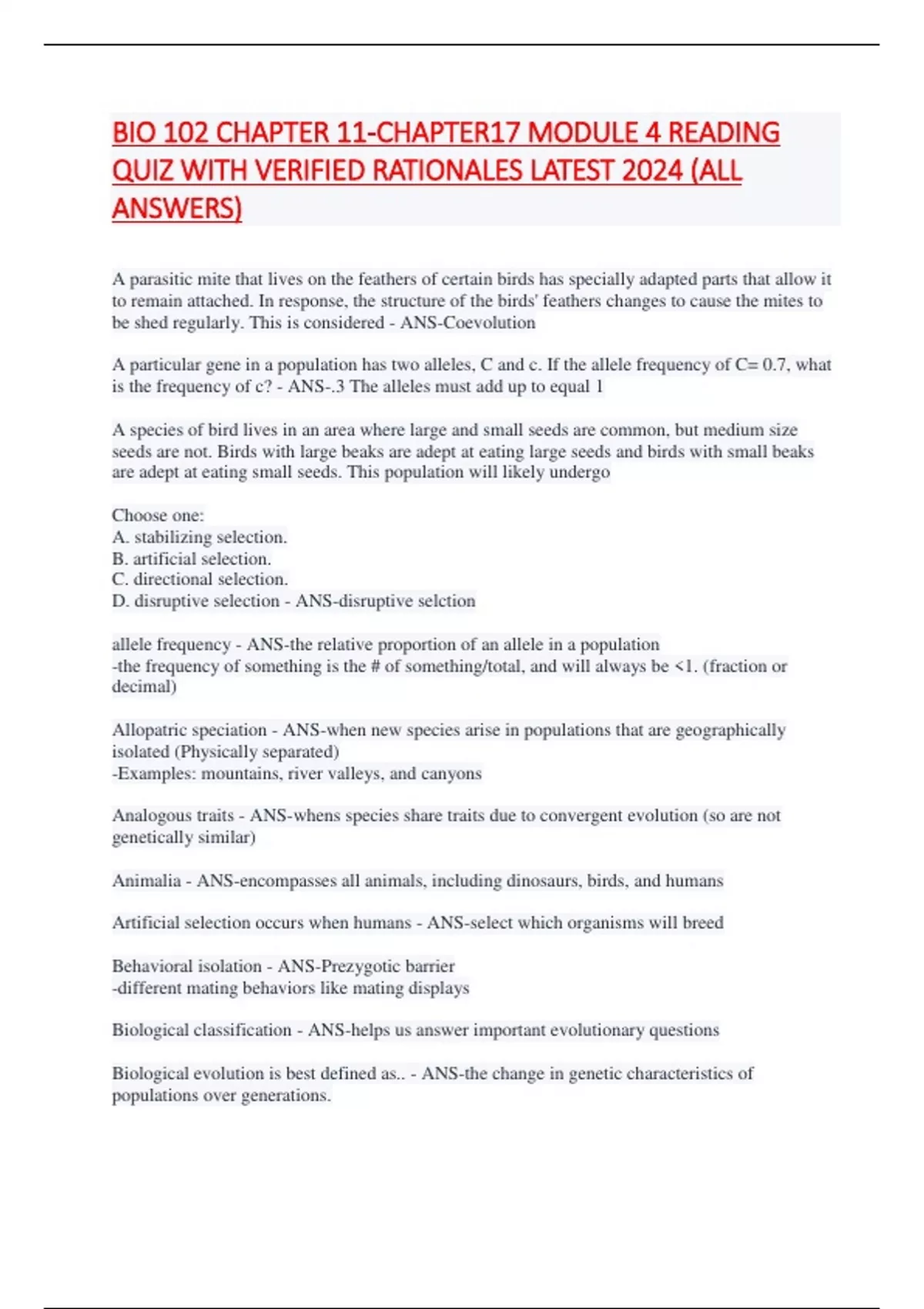 BIO 102 CHAPTER 11-CHAPTER17 MODULE 4 READING QUIZ WITH VERIFIED RATIONALES LATEST 2024 (ALL ANSWERS)