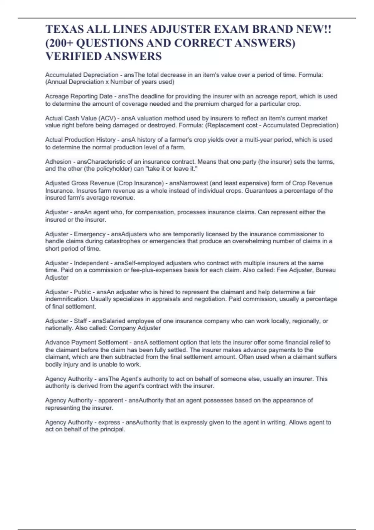 TEXAS ALL LINES ADJUSTER EXAM BRAND NEW!! (200+ QUESTIONS AND CORRECT ANSWERS) VERIFIED ANSWERSTEXAS ALL LINES ADJUSTER EXAM BRAND NEW!! (200+ QUESTIONS AND CORRECT ANSWERS) VERIFIED ANSWERSTEXAS ALL LINES ADJUSTER EXAM BRAND NEW!! (200+ QUESTIONS AND CORRECT ANSWERS) VERIFIED ANSWERSTEXAS ALL LINES ADJUSTER EXAM BRAND NEW!! (200+ QUESTIONS AND CORRECT ANSWERS) VERIFIED ANSWERSTEXAS ALL LINES ADJUSTER EXAM BRAND NEW!! (200+ QUESTIONS AND CORRECT ANSWERS) VERIFIED ANSWERSTEXAS ALL LINES ADJUSTER EXAM BRAND NEW!! (200+ QUESTIONS AND CORRECT ANSWERS) VERIFIED ANSWERS
