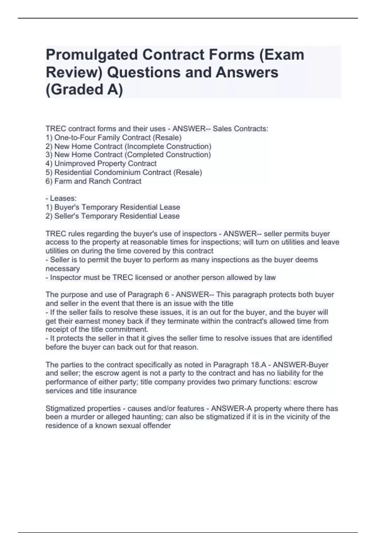 Promulgated Contract Forms (Exam Review) Questions and Answers (Graded A) Promulgated Contract Forms (Exam Review) Questions and Answers (Graded A) Promulgated Contract Forms (Exam Review) Questions and Answers (Graded A) TREC contract forms and their uses - ANSWER-- Sales Contracts: 1) One-to-Four Family Contract (Resale) 2) New Home Contract (Incomplete Construction) 3) New Home Contract (Completed Construction) 4) Unimproved Property Contract 5) Residential Condominium Contract (Resale) 6) Farm and Ranch Contract - Leases: 1) Buyer's Temporary Residential Lease 2) Seller's Temporary Residential Lease TREC rules regarding the buyer's use of inspectors - ANSWER-- seller permits buyer access to the property at reasonable times for inspections; will turn on utilities and leave