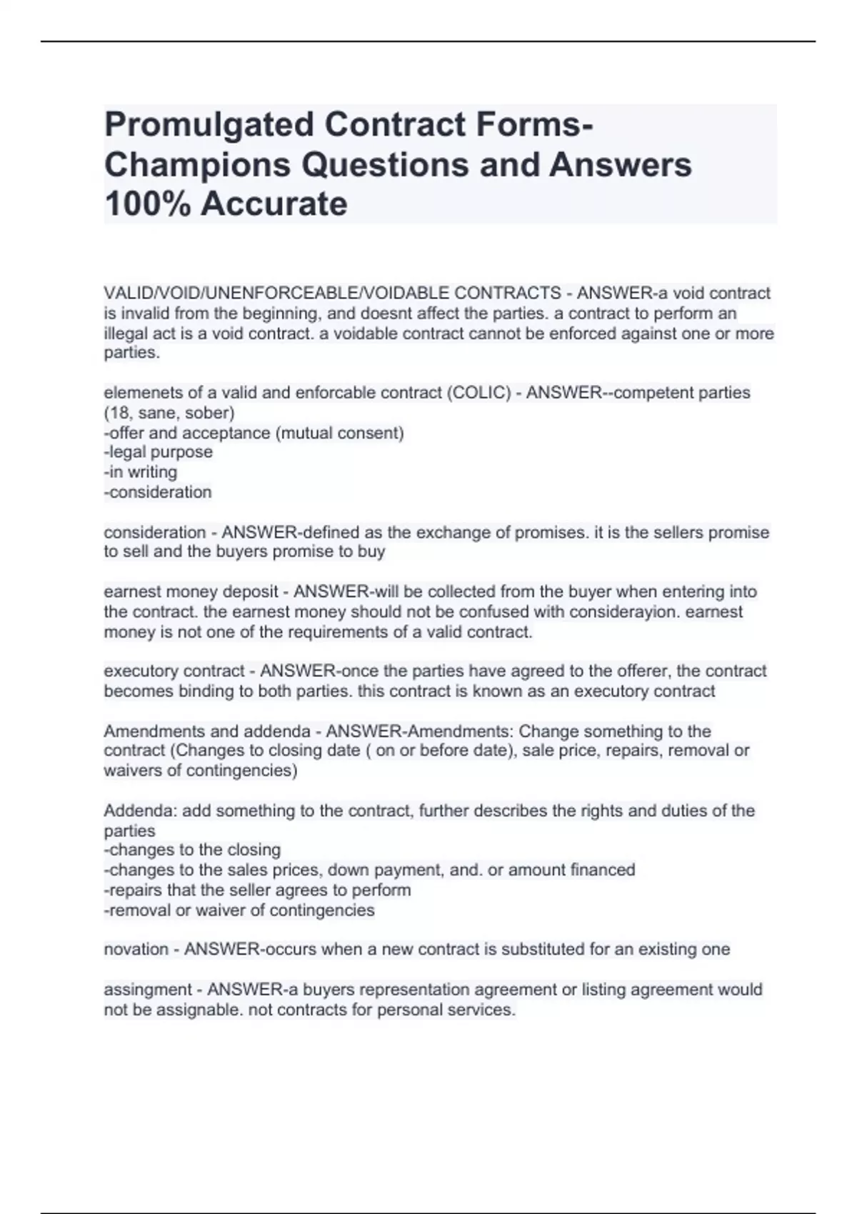 Promulgated Contract Forms- Champions Questions and Answers 100% AccuratePromulgated Contract Forms- Champions Questions and Answers 100% AccuratePromulgated Contract Forms- Champions Questions and Answers 100% AccuratePromulgated Contract Forms- Champions Questions and Answers 100% Accurate VALID/VOID/UNENFORCEABLE/VOIDABLE CONTRACTS - ANSWER-a void contract is invalid from the beginning, and doesnt affect the parties. a contract to perform an illegal act is a void contract. a voidable contract cannot be enforced against one or more parties. elemenets of a valid and enforcable contract (COLIC) - ANSWER--competent parties (18, sane, sober) -offer and acceptance (mutual consent) -legal purpose -in writing -consideration consideration - ANSWER-defined as the exchange of promises. it is the sellers promise to sell and the buyers promise to buy