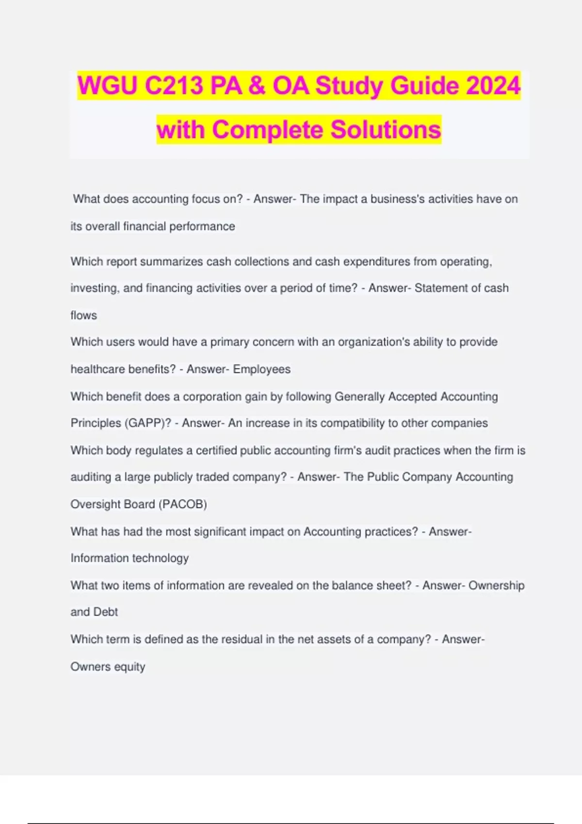 WGU C213 PA & OA Study Guide 2024 with Complete Solutions What does accounting focus on? - Answer- The impact a business's activities have on its overall financial performance Which report summarizes cash collections and cash expenditures from operating, investing, and financing activities over a period of time? - Answer- Statement of cash flows Which users would have a primary concern with an organization's ability to provide healthcare benefits? - Answer- Employees Which benefit does a corporation gain by following Generally Accepted Accounting Principles (GAPP)? - Answer- An increase in its compatibility to other companies Which body regulates a certified public accounting firm's audit practices when the firm is auditing a large publicly traded company? - Answer- The Public Company Accounting Oversight Board (PACOB) What has had the most significant impact on Accounting practices? - Answer- Information technology What two items of information are revealed on the balance sheet? - Answer- Ownership and Debt Which term is defined as the residual in the net assets of a company? - Answer- Owners equity Which situation should result in revenue recognition on the income statement for the year ending 12/31/14 if the firm is using accrual accounting? - Answer- In 2014, a company provides services to a customer for which cash will be collected the next year (2015). Which category on the statement of cash flows summarizes cash receipts and payments to owners and creditors of the company? - Answer- Cash from financing activities Where would an investor find a summary of a company's significant accounting policies? - Answer- In the notes to financial statements Which assurance does an external audit report provide for its readers? - Answer- The company's financial statements fairly reflect its financial position Information that can be verified - Answer- Reliable Information having to do with the matter at hand - Answer- Relevant Information that is important enough to make a difference - Answer- Material Information related to recognizing losses as they occur - Answer- Conservatism What is consistent with a continual decline in gross profit if the firm's cost of goods sold remains the same? - Answer- Continual decrease in sales Which form of debt should be reported in the long-term liability category? - Answer- Notes payable expected to be paid in 18 months Which values affect the measurement of net income? - Answer- Operating expenses & Ordinary gains and losses Which items' subtotals are included in a multi-step income statement? - Answer- Gross profit & Income from operations What is a common category in a statement of cash flows? - Answer- Cash from investing activities Which cash flow category would include "cash received from investors"? - Answer- Cash from financing activitie