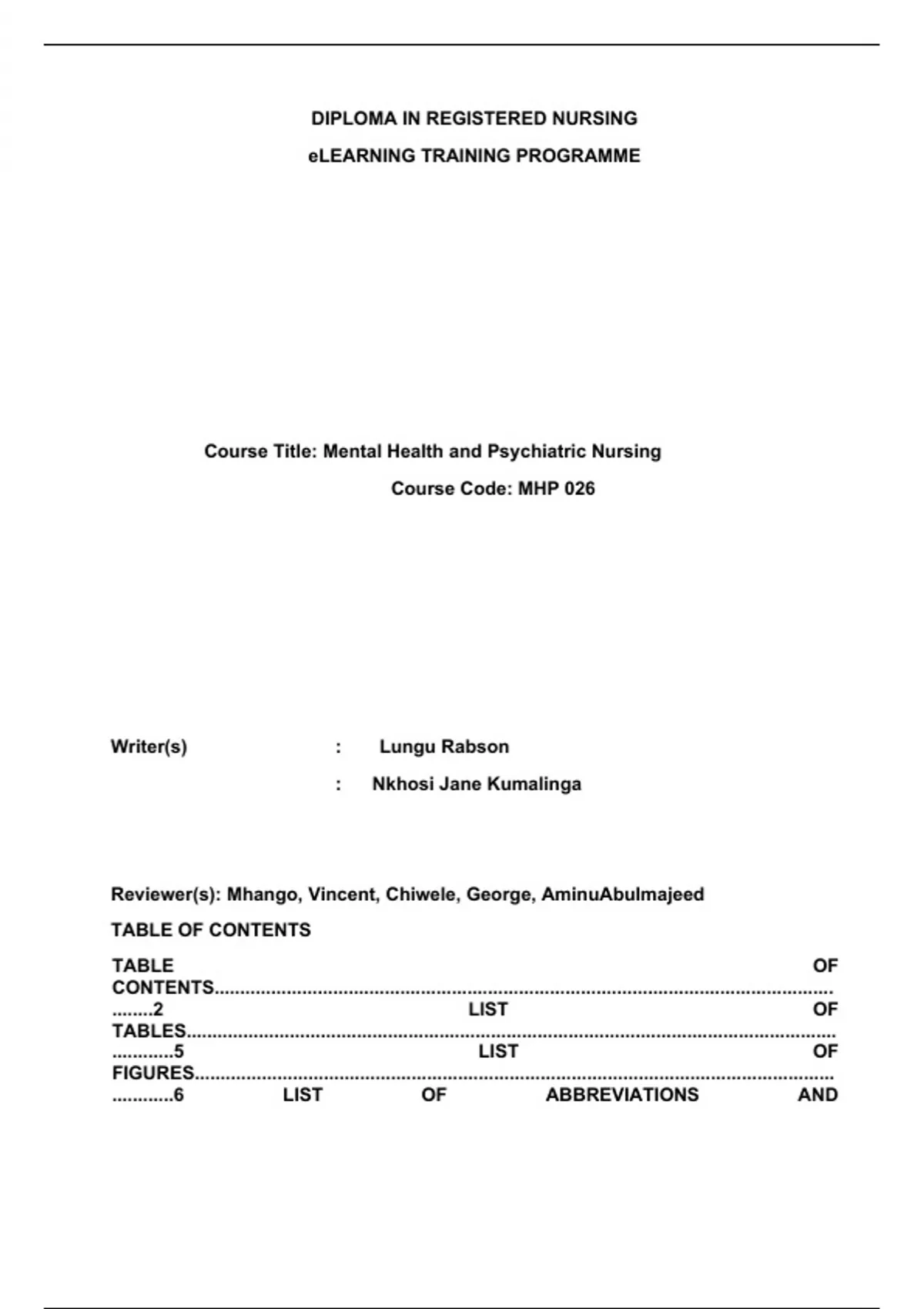 INTRODUCTION TO THE COURSE You are welcome to this interesting specialty nursing courseoffered inthe general nursing curriculum. The course focuses on the study of mental health and psychiatric nursing as part of general nursing and it is designed to provide you the opportunity of applying the nursing sciences in the care of patients suffering from psychiatric illnesses. This course will broaden your knowledge and skills needed for meeting the ever changing needs of psychiatric clients/patients, their families and society. The whole course will take 84 hours on theory and 210 hours practical experience which embraces community psychiatry. It is a full course similar to medicine and medical nursing. Psychiatry is a branch of medicine which deals with the study and treatment of mental diseases. It deals with the mind, emotions and behaviour of man precisely; the least understood portion of the human being. Psychiatric illness is characterized by a breakdown in the normal pattern of thought, emotion and behaviour. Psychiatric symptoms, problems and illness of all kinds are very common throughout life. Psychiatric nursing is a specialized branch of nursing in which the nurse utilizes personal knowledge of psychiatric theory and the available environment to effect therapeutic changes in the patients’ thoughts, feelings and behaviour. The nurse’s ability to effect these changes varies according to the nurse’s experience and education. The therapeutic role of the psychiatric nurse cannot be described only in terms of attitudes, feelings, relationship and understanding. What the nurse brings as a person to the treatment situation is directly related to her therapeutic effectiveness. Psychiatric nursing is concerned with the identification, promotion, prevention and care of patients suffering from mental disorders (Keltner, Schwecke and Bostrom, 2007). Thus, psychiatric nursing is the process whereby the nurse assists persons, individuals or groups in developing a more positive self-concept, a more harmonious pattern of interpersonal relationships and a more productive role in the society. MAIN COURSE OBJECTIVE Students will be equipped with knowledge and skills in mental health to enable them understand human behaviour and manage clients with mental disorders. COURSE OBJECTIVES At the end of the course, you should be able to: 1. Describe normal human behaviour 2. Describe abnormal human behaviour 3. Describe common psychiatric conditions 4. Apply psychiatric nursing principles in managing patients suffering from mental illness 5. Explain how the family can be used as a primary resource in rehabilitating patients suffering from mental illnesses 6. Identify resources within the community for rehabilitation of patients suffering from mental illness 7. Describe how available resources can be utilized in rehabilitation of the mentally ill 8. Apply communication skills in identifying clients at risk within the family and community COURSE CONTENT This course has eight units/titles. UNIT 1: Introduction to Mental Health-Psychiatric Nursing In this unit, you will be introduced to mental health and psychiatric nursing concepts and approaches to create an understanding of this specialty. Psychiatric nursing as you may understand, is a branch of nursing concerned with identification, prevention and care of people suffering from mental illness (Townsend, 2010).Hence, from this brief description of psychiatric nursing, it is understood that you will be able to provide minimal specialised care to patients suffering from mental health and psychiatric illnesses in communities around you as well as at the health facility you will be working from after you qualify from your training in general nursing. UNIT 2: Psychiatric Nursing Skills You might acknowledge that psychiatric nursing skills comprise the foundation of a nurse-patient therapeutic relationship, which is key to intervention modality of psychiatric nursing and for a psychiatric nurse to be a good communicator; he/she should reinforce self-awareness before dealing with the concerns of a psychiatric patient (Corpel, 1996).Thus, you will learn numerous psychiatric nursing skills as organised in this unit 2. UNIT 3: Classification and Management of Psychiatric Disorders As for this unit, youwill learn about classification of psychiatric disorders mainly from two mostly recognised classification criteria by World Health Organisation (WHO) despite that there are many other diagnostic criteria by the Chinese, Russians and Japanese. The International Classification of Diseases (ICD) of British origin has undergone numerous changes from ICD1 to the current ICD10; probably there should be even a newer version now which could be in the way out for publication. The other approach to classification of disease entities in mental health is through the American Diagnostic Statistical Manual (DSM) which also went through several reviews up to the current DSM V (2014) from DSM I, II, III and IV. The DSM uses Axes; Axis I, II, III, IV and V in providing a diagnosis while the ICD 10 uses a code F for instance F00-F99, where F20 implies schizophrenia, F30, F10, mean other disease entities, among others. UNIT 4: Conditions not attributed to mental disorders that are a focus of attention and treatment You may be aware that in psychiatry and psychiatric nursing, other conditions might be treated but they do not imply that they are psychiatric illnesses; nevertheless, because of behavioural disorders that arise due to a medical condition, psychiatric attention is and may be rendered/ provided. Epilepsy for example is a medical condition that receives awesome management in psychiatry. UNIT 5: Management of a Client with Psychiatric Emergency As you proceed in learning in this unit on psychiatric disorders, you will come across psychiatric disorders that jeopardise the lives of the patient him/herself, staff and people in the community and such conditions are treated as psy