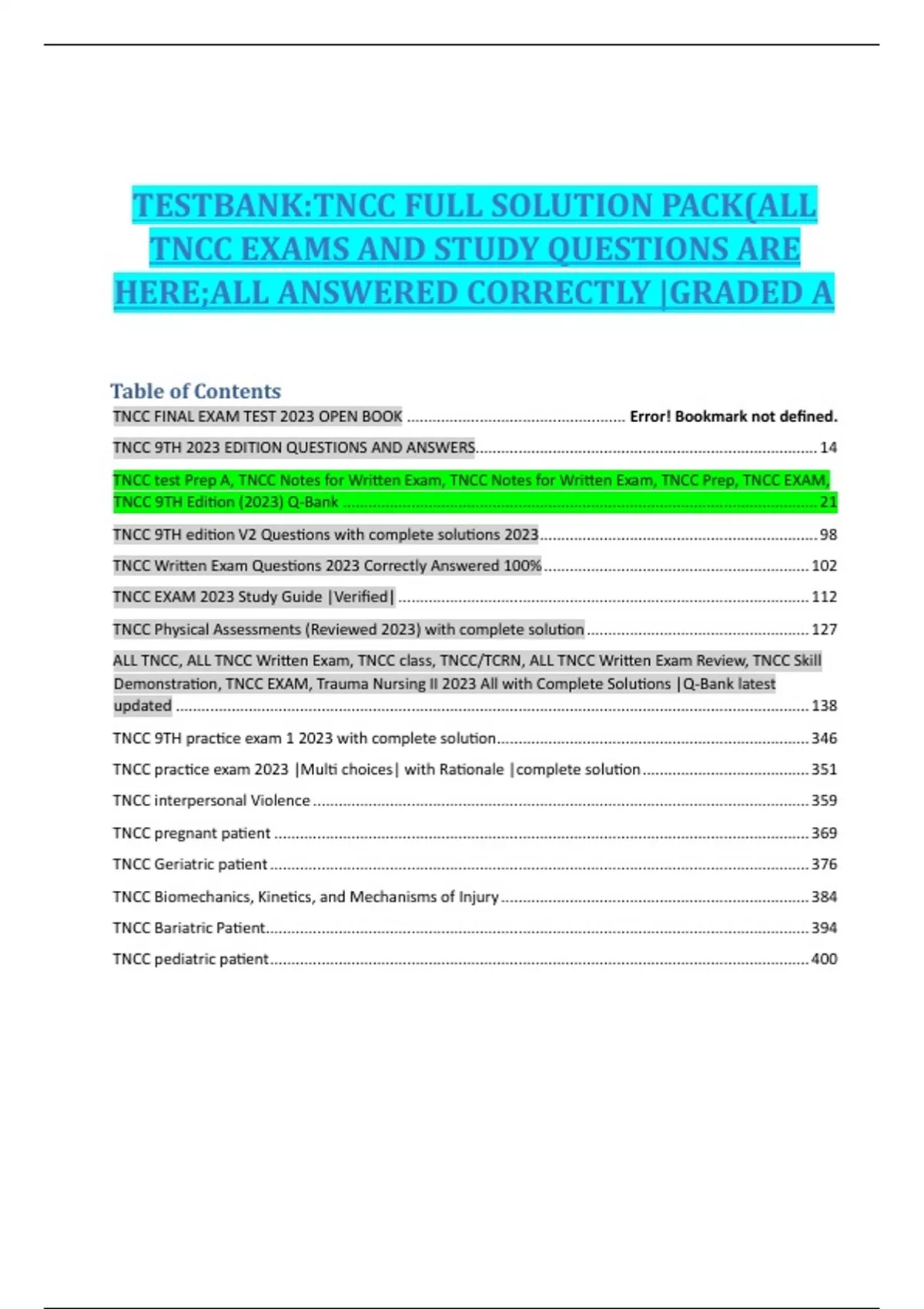TESTBANK:TNCC FULL SOLUTION PACK(ALL TNCC EXAMS AND STUDY QUESTIONS ARE HERE;ALL ANSWERED CORRECTLY |GRADED A