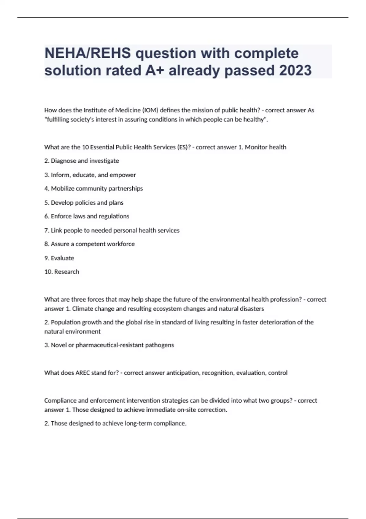 NEHA REHS question with complete solution rated A+ already passed 2024 How does the Institute of Medicine (IOM) defines the mission of public health? - correct answer As "fulfilling society's interest in assuring conditions in which people can be healthy". What are the 10 Essential Public Health Services (ES)? - correct answer 1. Monitor health 2. Diagnose and investigate 3. Inform, educate, and empower 4. Mobilize community partnerships 5. Develop policies and plans 6. Enforce laws and regulations 7. Link people to needed personal health services 8. Assure a competent workforce 9. Evaluate 10. Research What are three forces that may help shape the future of the environmental health profession? - correct answer 1. Climate change and resulting ecosystem changes and natural disasters 2. Population growth and the global rise in standard of living resulting in faster deterioration of the natural environment 3. Novel or pharmaceutical-resistant pathogens What does AREC stand for? - correct answer anticipation, recognition, evaluation, control Compliance and enforcement intervention strategies can be divided into what two groups? - correct answer 1. Those designed to achieve immediate on-site correction. 2. Those designed to achieve long-term compliance.