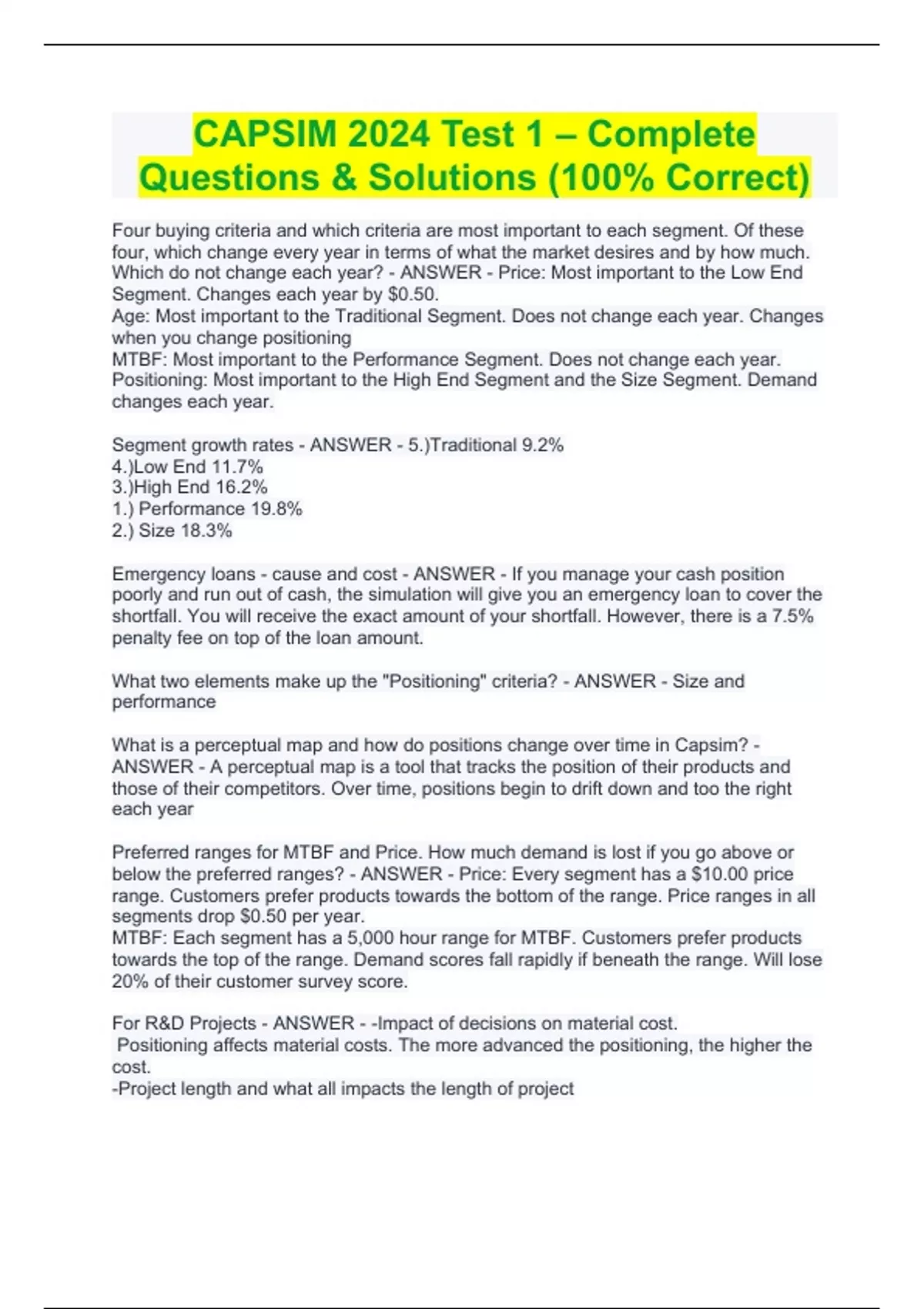CAPSIM 2024 Test 1 – Complete Questions & Solutions (100% Correct) CAPSIM 2024 Test 1 – Complete Questions & Solutions (100% Correct) Four buying criteria and which criteria are most important to each segment. Of these four, which change every year in terms of what the market desires and by how much. Which do not change each year? - ANSWER - Price: Most important to the Low End Segment. Changes each year by $0.50. Age: Most important to the Traditional Segment. Does not change each year. Changes when you change positioning MTBF: Most important to the Performance Segment. Does not change each year. Positioning: Most important to the High End Segment and the Size Segment. Demand changes each year. Segment growth rates - ANSWER - 5.)Traditional 9.2% 4.)Low End 11.7% 3.)High End 16.2% 1.) Performance 19.8% 2.) Size 18.3% Emergency loans - cause and cost - ANSWER - If you manage your cash position poorly and run out of cash, the simulation will give you an emergency loan to cover the shortfall. You will receive the exact amount of your shortfall. However, there is a 7.5% penalty fee on top of the loan amount. What two elements make up the "Positioning" criteria? - ANSWER - Size and performance What is a perceptual map and how do positions change over time in Capsim? - ANSWER - A perceptual map is a tool that tracks the position of their products and those of their competitors. Over time, positions begin to drift down and too the right each year Preferred ranges for MTBF and Price. How much demand is lost if you go above or below the preferred ranges? - ANSWER - Price: Every segment has a $10.00 price range. Customers prefer products towards the bottom of the range. Price ranges in all segments drop $0.50 per year. MTBF: Each segment has a 5,000 hour range for MTBF. Customers prefer products towards the top of the range. Demand scores fall rapidly if beneath the range. Will lose 20% of their customer survey score. For R&D Projects - ANSWER - -Impact of decisions on material cost. Positioning affects material costs. The more advanced the positioning, the higher the cost. -Project length and what all impacts the length of project Project lengths can be as short as three months or as long as three years. Project lengths will increase when the company puts two or more products into R&D at the same time. When this happens each R&D project takes longer. Assembly line automation levels also affect project lengths -Impact of project length on R&D project management cost R&D project costs are driven by the amount of time they take to complete. A six month project costs $500,000 and a one year project costs $1,000,000.