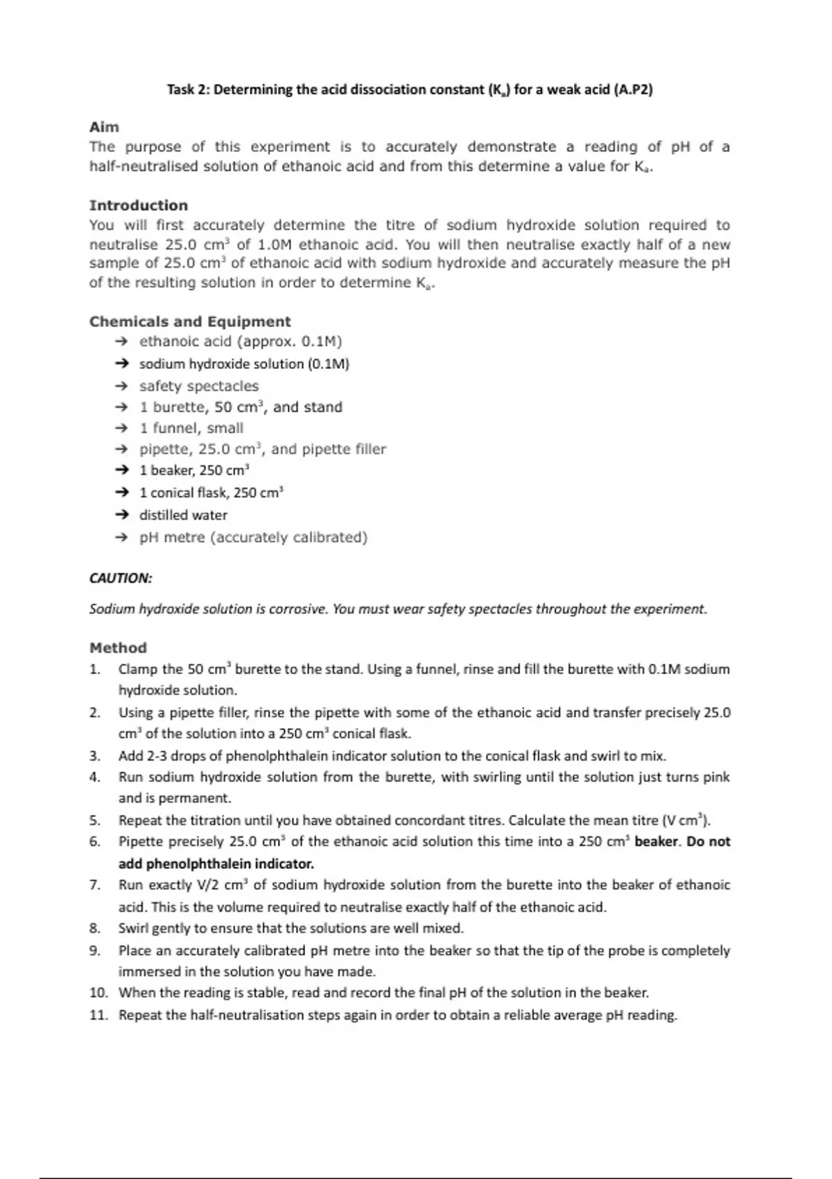 neutralise 25.0 cm3 of 1.0M ethanoic acid. You will then neutralise exactly half of a new