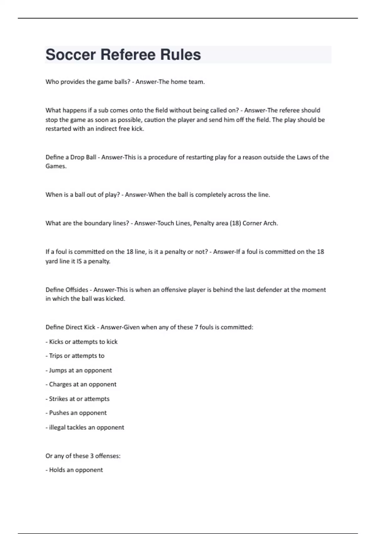 Who provides the game balls? - Answer-The home team. What happens if a sub comes onto the field without being called on? - Answer-The referee should stop the game as soon as possible, caution the player and send him off the field. The play should be restarted with an indirect free kick. Define a Drop Ball - Answer-This is a procedure of restarting play for a reason outside the Laws of the Games. When is a ball out of play? - Answer-When the ball is completely across the line. What are the boundary lines? - Answer-Touch Lines, Penalty area (18) Corner Arch. If a foul is committed on the 18 line, is it a penalty or not? - Answer-If a foul is committed on the 18 yard line it IS a penalty. Define Offsides - Answer-This is when an offensive player is behind the last defender at the moment in which the ball was kicked. Define Direct Kick - Answer-Given when any of these 7 fouls is committed: - Kicks or attempts to kick - Trips or attempts to - Jumps at an opponent - Charges at an opponent - Strikes at or attempts - Pushes an opponent - illegal tackles an opponent Or any of these 3 offenses: - Holds an opponent- Spits at an opponent - Hits the ball with his hand Indirect Free Kick - Answer-It is awarded if a Goalkeeper does any of the rest: - Holds the balls for more than 6 seconds - Touches the ball with his hands after dropping it - Picks the ball up after it's been kicked to him by his defender - Picks up the ball from a throw in from his team Also awarded for players: - dangerous plays - disruption of play, impedes progress of play - any offense that should have the game stop not in direct kick What are the 3 types of fouls - Answer-- Careless: Direct Kick - Reckless: Yellow card - Excessive: Red card When is it a foul or shoulder to shoulder - Answer-Shoulder to Shoulder is legal; however, as soon as an arm is extended it is a foul. Cautionable offenses - Answer-(F)ailure to respect 10 yards (E)ntering w/ no permission (D)issent by word or action (D)elaing the restart of play (D)eliberaty leaving the feild (U)nsporting behavior (P)ersistent infringment