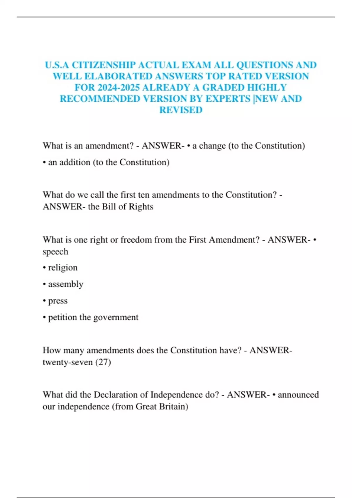 U.S.A CITIZENSHIP ACTUAL EXAM ALL QUESTIONS AND WELL ELABORATED ANSWERS TOP RATED VERSION FOR ALREADY A GRADED HIGHLY RECOMMENDED VERSION BY EXPERTS |NEW AND REVISED