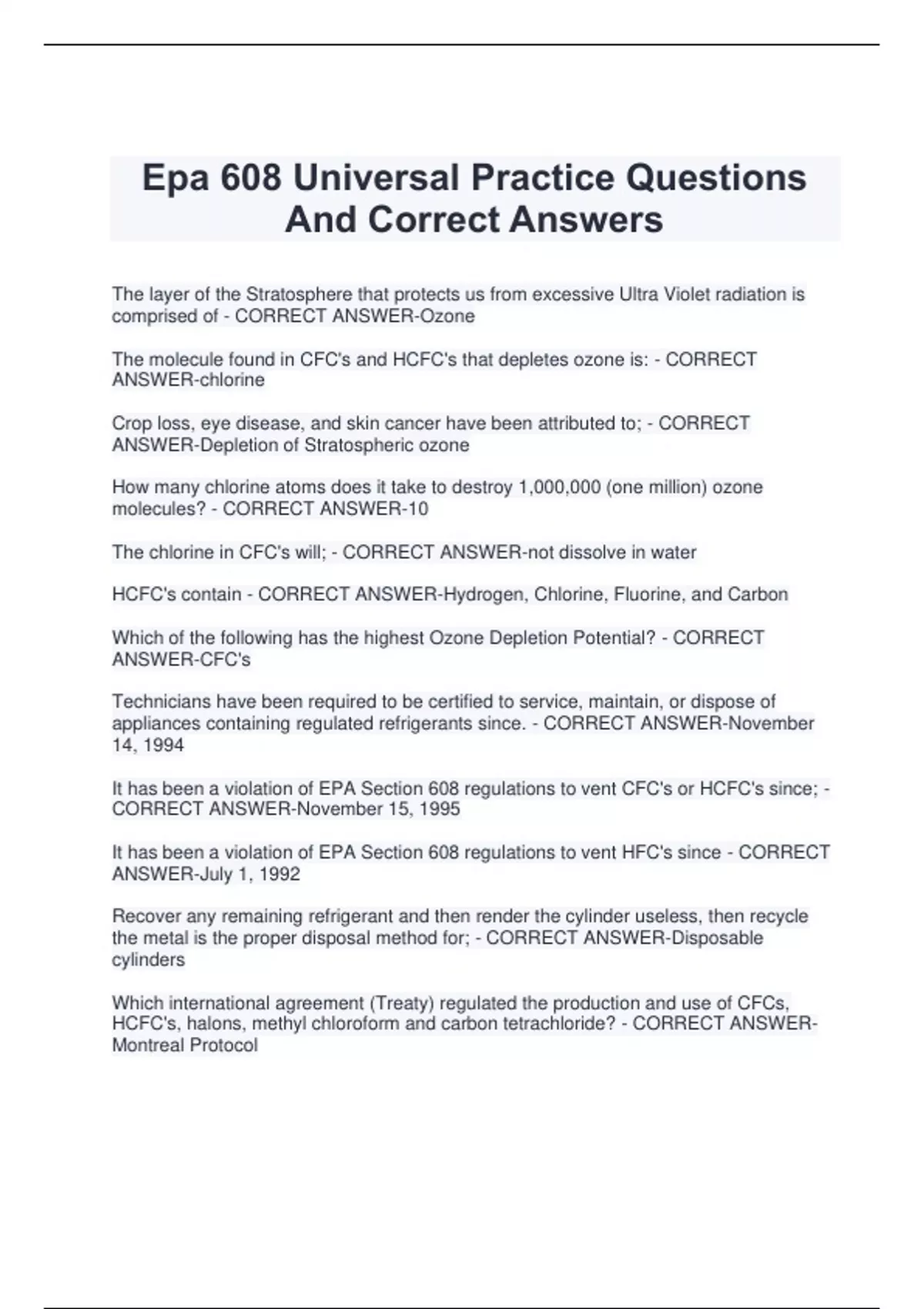 Epa 608 Universal Practice Questions And Correct Answers The layer of the Stratosphere that protects us from excessive Ultra Violet radiation is comprised of - CORRECT ANSWER-Ozone The molecule found in CFC's and HCFC's that depletes ozone is: - CORRECT ANSWER-chlorine Crop loss, eye disease, and skin cancer have been attributed to; - CORRECT ANSWER-Depletion of Stratospheric ozone How many chlorine atoms does it take to destroy 1,000,000 (one million) ozone molecules? - CORRECT ANSWER-10 The chlorine in CFC's will; - CORRECT ANSWER-not dissolve in water HCFC's contain - CORRECT ANSWER-Hydrogen, Chlorine, Fluorine, and Carbon Which of the following has the highest Ozone Depletion Potential? - CORRECT ANSWER-CFC's