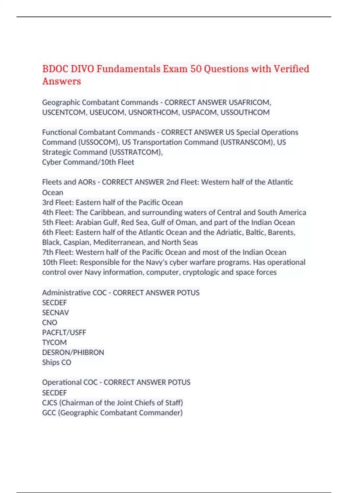 BDOC DIVO Fundamentals Exam 50 Questions with Verified Answers Geographic Combatant Commands - CORRECT ANSWER USAFRICOM, USCENTCOM, USEUCOM, USNORTHCOM, USPACOM, USSOUTHCOM Functional Combatant Commands - CORRECT ANSWER US Special Operations Command (USSOCOM), US Transportation Command (USTRANSCOM), US Strategic Command (USSTRATCOM), Cyber Command/10th Fleet Fleets and AORs - CORRECT ANSWER 2nd Fleet: Western half of the Atlantic Ocean 3rd Fleet: Eastern half of the Pacific Ocean 4th Fleet: The Caribbean, and surrounding waters of Central and South America 5th Fleet: Arabian Gulf, Red Sea, Gulf of Oman, and part of the Indian Ocean 6th Fleet: Eastern half of the Atlantic Ocean and the Adriatic, Baltic, Barents, Black, Caspian, Mediterranean, and North Seas 7th Fleet: Western half of the Pacific Ocean and most of the Indian Ocean 10th Fleet: Responsible for the Navy's cyber warfare programs. Has operational control over Navy information, computer, cryptologic and space forces Administrative COC - CORRECT ANSWER POTUS SECDEF SECNAV CNO PACFLT/USFF TYCOM DESRON/PHIBRON Ships CO Operational COC - CORRECT ANSWER POTUS SECDEF CJCS (Chairman of the Joint Chiefs of Staff) GCC (Geographic Combatant Commander) NCC (Navy Component Commander) NFC (Numbered Fleet Commander) CSG/ESG DESRON/PHIBRON Ships CO DIVO Responsibilities - CORRECT ANSWER -Supervise the performance of the work within the division carrying out the shipboard maintenance and material management. -Schedule and conduct training for division personnel. - By personal supervision and frequent inspection, ensure that spaces, equipment, and supplies assigned to the division are maintained. - Promptly reports to department head repairs which may be required or other defects which need correction. -Assigns personnel to watches and duties within division and develop rotation programs. -Maintains a Division notebook -Responsible for all administration for the division -Ensures damage control equipment, fittings, and check-off lists is assigned. Definition of Deadly Force - CORRECT ANSWER "The force that a person uses causing, or that a person knows or should know that would create a substantial risk of causing death or serious bodily harm. " Serious Bodily Harm - CORRECT ANSWER Does not include black eyes, bloody nose or minor injuries, but does include fractured or dislocated bones, deep cuts, torn members of the body, serious damage to the internal organs and other life-threatening injuries. Deadly Force Triangle - CORRECT ANSWER Capability Opportunity Intent Deadly Force Continuum - CORRECT ANSWER Level-1: Presence Level-2: Verbal Commands Level-3: Soft Control (Restraining/Detaining) Level-4: Hard Control (Compliance Techniques) Level-5: Non-Lethal Force Level-6: Deadly Force Deadly Force Conditions - CORRECT ANSWER Inherent Right of Self-Defense. Defense of Others. Assets Vital to National Security. Inherently Dangerous Property. National Critical Infrastructure. Public Health or Safety. Escape. Arrest or Apprehension. Defending against animals. Responsibilites of OOD - CORRECT ANSWER Supervise Inspect Control Notify Report Log Role of ATTWO - CORRECT ANSWER Tactically employs command assets to defend the unit against terrorist attack when in port When in port at a U.S. Navy installation, coordinate integration of waterborne and shore side Anti-Terrorism Force Protection (ATFP) assets into installation security forces Chief of the Guard and other watchstanders (i.e. security boats) report to the ATTWO ATTWO reports to the Command Duty Officer (CDO) Similar in function to Tactical Action Officer Monitor nets used by watchstanders to ensure proper use: No Obscene and profane language No Superfluous, false, or deceptive communications or signals Transmission not within station limits or by unauthorized stations Transmission by unauthorized operators ISP (In-Port Security Plan) - CORRECT ANSWER Developed prior to entering any foreign port and depending on current Fleet Commander requirements Supplement standing ATFP plans with specific event-specific procedures relevant to your ship Importance of Decklog - CORRECT ANSWER Contains a chronological record of events that occurred during the watch Serves as the historical and legal record for the ship and contains unclassified information The Petty Officer of the Watch maintains log, but OOD has overall responsibility for it and signs it after each watch Entries must be legible and written IAW Preparing, Maintaining, and Submitting the Ship's Deck Log, OPNAVINST 3100.7 How to ring someone onboard/ashore and passing honors - CORRECT ANSWER Sound the bells in groups of two 4 for O-5. O-6 6 for O-7, O-8 8 for O-9, O-10 Passing honors underway Signals for actions for passing honors are: One Blast: attention to starboard Two Blasts: attention to port One blast: hand salute Two blasts: end salute Three blasts: carry on PESTO - CORRECT ANSWER Personnel- FLTMPS/RADM Equipment- MFOM Supply- RSUPPLY Training- TFOM/TORIS Ordinance- OIS Types of Casreps and categories - CORRECT ANSWER Initial - (NLT) 24 hours after the casualty occurs and cannot be corrected within 48 hours Update - Changes to information submitted on initial or previous updates Correction - Report the repair of previously CASREP'd equipment. CASCORs will be submitted as soon as possible after equipment is repaired and in operational condition. Cancellation - Submitted as soon as it is determined that casualty will not be fixed by routine means CAT 2 - Minor degradation in primary mission - Major degradation or total loss of secondary mission - Transmitted Priority (P) Precedence - Updates must be submitted every 30 days CAT 3 - Major degradation in primary or secondary - Transmitted Immediate (O) Precedence - Updates must be submitted every 10 days CAT 4 - Total loss of primary mission - Transmitted Immediate (O) Precedence - Updates must be submitted every 72 hours What website do we use to look up schools - CORRECT ANSWER CANTRAC - Catalo