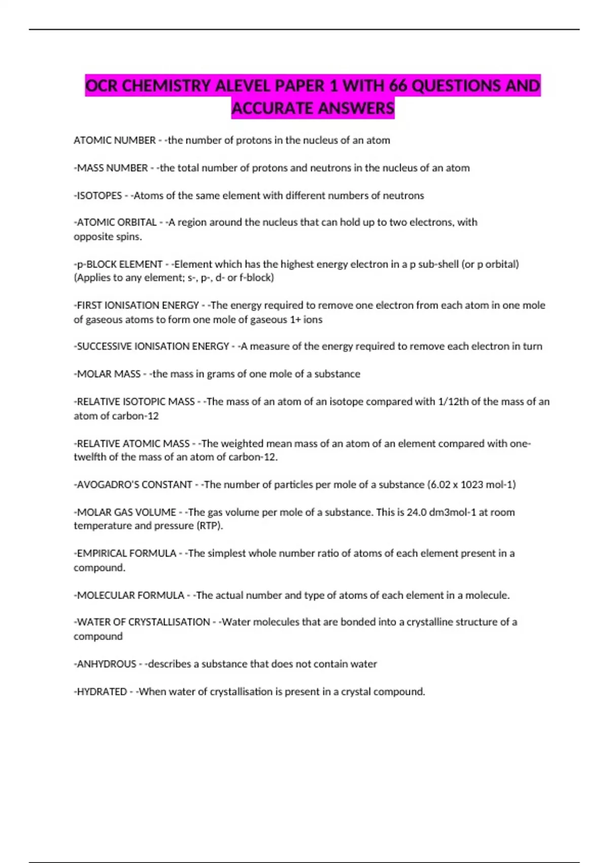 OCR CHEMISTRY ALEVEL PAPER 1 WITH 66 QUESTIONS AND ACCURATE ANSWERS