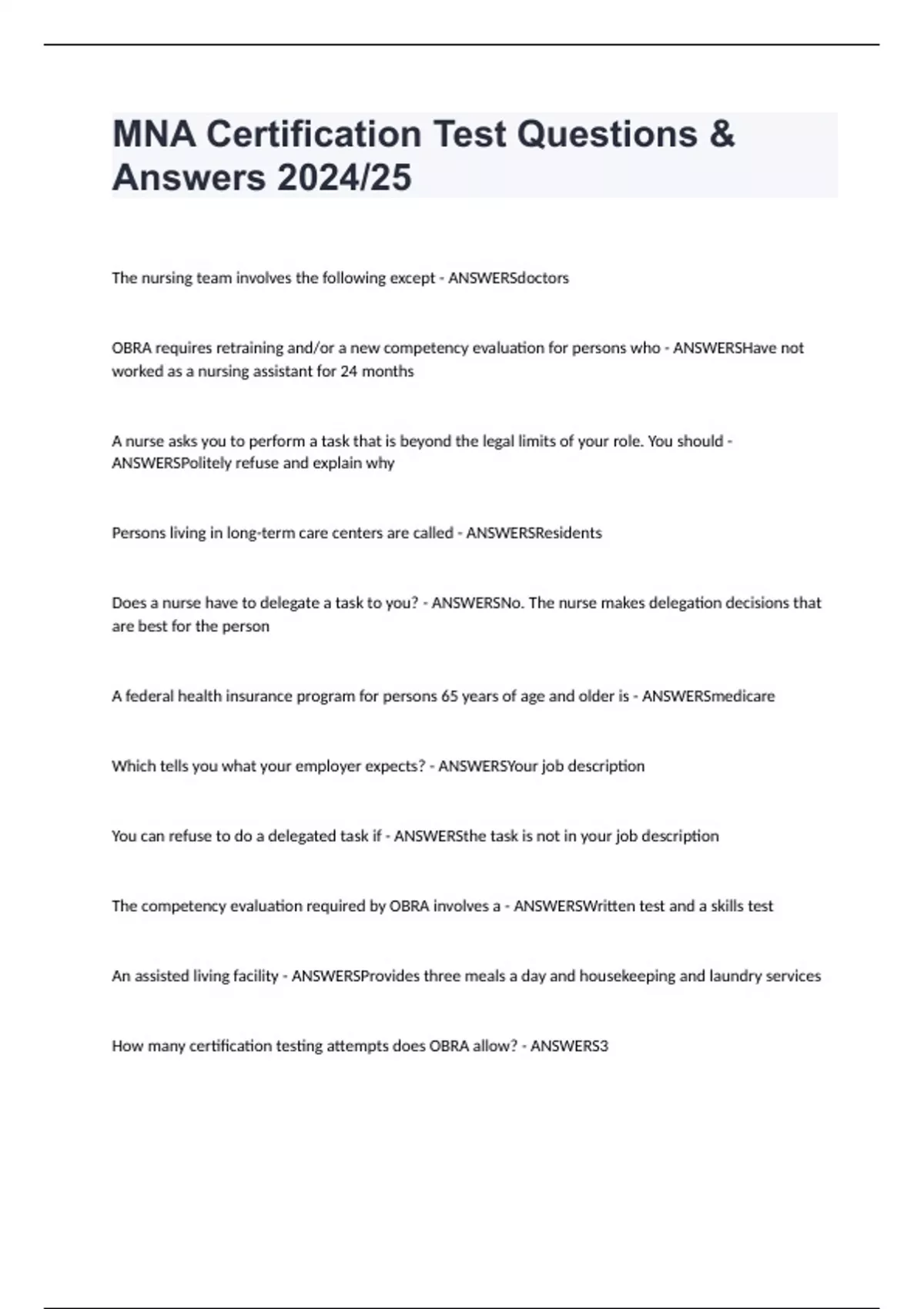 MNA Certification Test Questions & Answers 2024/25 The nursing team involves the following except - ANSWERSdoctors OBRA requires retraining and/or a new competency evaluation for persons who - ANSWERSHave not worked as a nursing assistant for 24 months A nurse asks you to perform a task that is beyond the legal limits of your role. You should - ANSWERSPolitely refuse and explain why Persons living in long-term care centers are called - ANSWERSResidents Does a nurse have to delegate a task to you? - ANSWERSNo. The nurse makes delegation decisions that are best for the person A federal health insurance program for persons 65 years of age and older is - ANSWERSmedicare Which tells you what your employer expects? - ANSWERSYour job description You can refuse to do a delegated task if - ANSWERSthe task is not in your job description The competency evaluation required by OBRA involves a - ANSWERSWritten test and a skills test An assisted living facility - ANSWERSProvides three meals a day and housekeeping and laundry services How many certification testing attempts does OBRA allow? - ANSWERS3