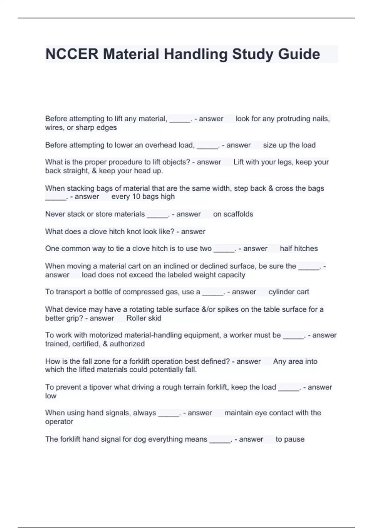 NCCER Material Handling Study Guide Questions with correct Answers