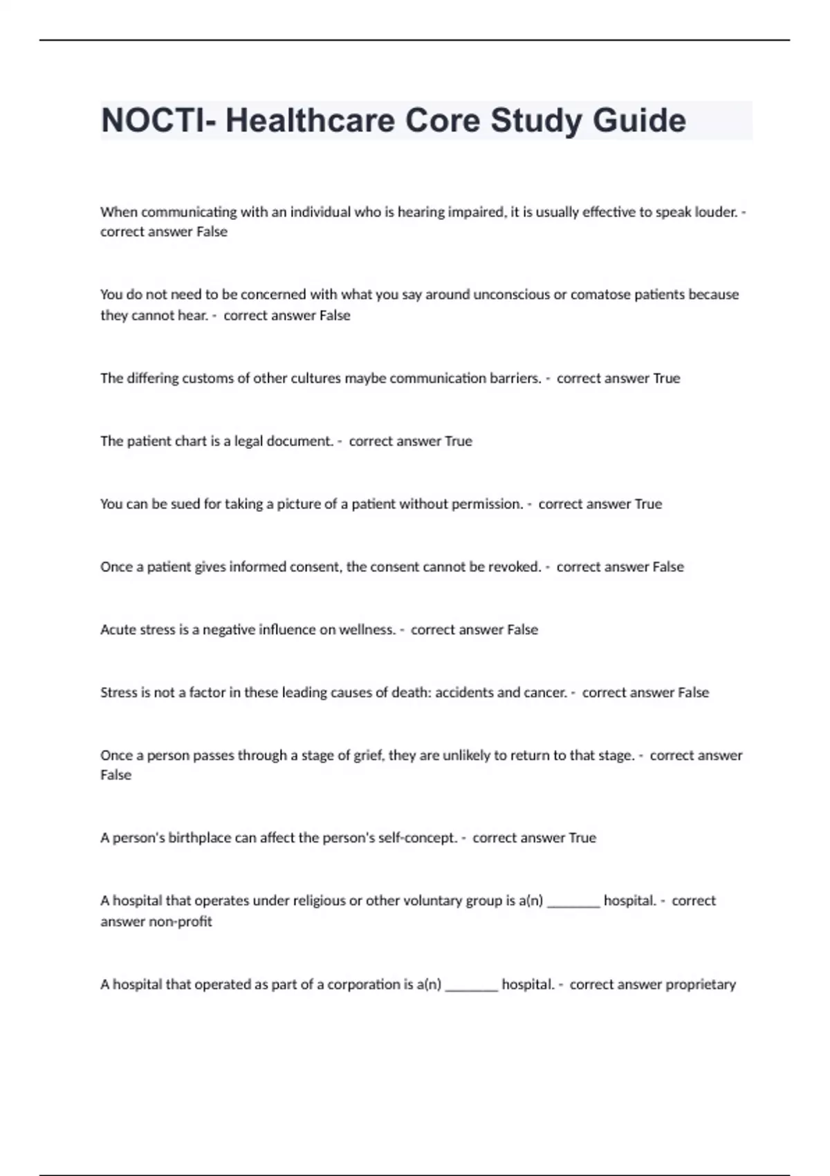 NOCTI- Healthcare Core Study GuideWhen communicating with an individual who is hearing impaired, it is usually effective to speak louder. - correct answer False You do not need to be concerned with what you say around unconscious or comatose patients because they cannot hear. - correct answer False The differing customs of other cultures maybe communication barriers. - correct answer True The patient chart is a legal document. - correct answer True You can be sued for taking a picture of a patient without permission. - correct answer True Once a patient gives informed consent, the consent cannot be revoked. - correct answer False Acute stress is a negative influence on wellness. - correct answer False Stress is not a factor in these leading causes of death: accidents and cancer. - correct answer False Once a person passes through a stage of grief, they are unlikely to return to that stage. - correct answer False A person's birthplace can affect the person's self-concept. - correct answer True A hospital that operates under religious or other voluntary group is a(n) _______ hospital. - correct answer non-profit A hospital that operated as part of a corporation is a(n) _______ hospital. - correct answer proprietary