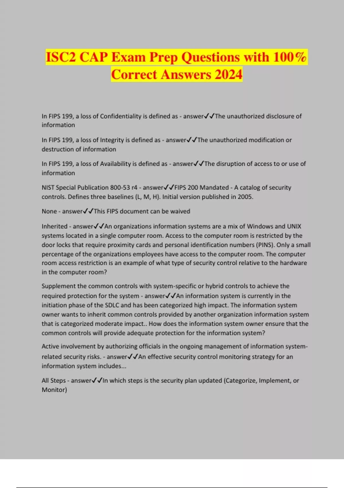 ISC2 CAP Exam Prep Questions with 100% Correct Answers 2024 In FIPS 199, a loss of Confidentiality is defined as - answerThe unauthorized disclosure of information In FIPS 199, a loss of Integrity is defined as - answerThe unauthorized modification or destruction of information In FIPS 199, a loss of Availability is defined as - answerThe disruption of access to or use of information NIST Special Publication 800-53 r4 - answerFIPS 200 Mandated - A catalog of security controls. Defines three baselines (L, M, H). Initial version published in 2005. None - answerThis FIPS document can be waived Inherited - answerAn organizations information systems are a mix of Windows and UNIX systems located in a single computer room. Access to the computer room is restricted by the door locks that require proximity cards and personal identification numbers (PINS). Only a small percentage of the organizations employees have access to the computer room. The computer room access restriction is an example of what type of security control relative to the hardware in the computer room? Supplement the common controls with system-specific or hybrid controls to achieve the required protection for the system - answerAn information system is currently in the initiation phase of the SDLC and has been categorized high impact. The information system owner wants to inherit common controls provided by another organization information system that is categorized moderate impact.. How does the information system owner ensure that the common controls will provide adequate protection for the information system? Active involvement by authorizing officials in the ongoing management of information system- related security risks. - answerAn effective security control monitoring strategy for an information system includes... All Steps - answerIn which steps is the security plan updated (Categorize, Implement, or Monitor) An enterprise security authorization program is considered successful when - answerA) provides an effective means of meeting requirements B) permits efficient oversight of its activities C) provides assurance that controls are implemented at the system level Hybrid - answerA large organization has a documented information system policy that has been reviewed and approved by senior officials and is readily available to all organizational staff. This information security policy explicitly addresses each of the 17 control families in NIST SP 800-53, Revision.3. Some system owners also established procedures for the technical class of security controls on certain of their systems. In their respective system security plans, control AC-1 Access Control Policy and Procedures (a technical class security control) must be identified as what type of control? NIST Special Publication 800-37, Revision 1 - answerThis manual defines the RIsk Management Framework NIST Special Publication 800-30 - answerThis manual defines how to conduct a risk assessment FISMA - answerFederal Information Security Management Act Federal Information Security Management Act (FISMA) - answerThis raised visibility through government on certification, accreditation and system authorizations and follows NIST SP 800- 37 SDLC phases within the RMF in order - answer1) Initiation 2) Development/Acquisition 3) Implementation 4) Operation/Maintenance 5) Disposal Information System Owner (ISO) - answerThis organizational official is responsible for the procurement, development, integration, modification, operation, maintenance, and disposal of an information system. FIPS 200 - answerThis document specifies security requirements for federal information and information systems in 17 security-related areas that represent a broad-based, balanced information security program. Specifies that a minimum baseline of security controls, as defined in NIST SP 800-53, will be implemented. Specifies that the baselines are to be appropriately tailored. Leveraged - answerWhich authorization approach (leveraged, single, and joint or site specific) considers time elapsed since the authorization results were produced, the environment of operation, the criticality/sensitivity of the information, and the risk tolerance of other organizations? Authorizing Official (AO) - answerWhen an authorization to operation (ATO) is issued, this role authoritatively accepts residual risk on behalf of the organization. Information Technology Systems - answerThe objective of system authorization is to ensure the security of... Will NEVER have a primary role in any RMF step tasks - answerA) Information system security officer (ISSO) B) Information system security engineer (ISSE) Authorizing Official (AO) - answerWho does the Security Control Assessor (SCA) report directly to? Independence and Technical Confidence - answerThe two basic traits a Security Control Assessor (SCA) must have Successful information technology develops separate security perimeters covering individual critical resources according to the system boundaries rather than one perimeter to cover all critical resources. This works because... - answerA) Systems are distance B) Their limits can be defined in practical terms C) Security is comparatively easy to implement at system level Authorizing Official (AO) - answerThe Information System Owner (ISO) is appointed by this person Chief Information Officer (CIO) - answerThe Common Control Provider (CCP) is appointed by this person Certification - answerThe process to assess effectiveness of security controls NIST Special Publication 800-53, Revision 4 - answerThis publication introduces the new family Program Management as well as eight additional security and privacy control families to the FIPS 200 17 security control families. The three Risk Management core components - answerA) Risk Assessment (understand what can go wrong) B) Risk Mitigation (identify how risk is managed)