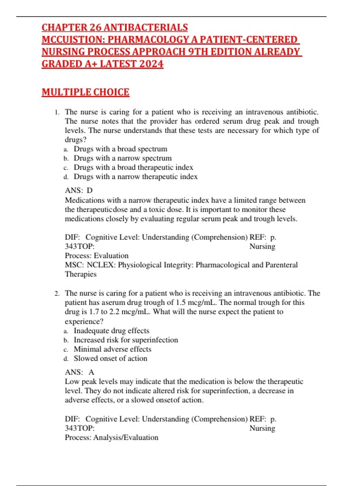 The nurse is caring for a patient who is receiving an intravenous antibiotic. The nurse notes that the provider has ordered serum drug peak and trough levels. The nurse understands that these tests are necessary for which type of drugs? a. Drugs with a broad spectrum b. Drugs with a narrow spectrum c. Drugs with a broad therapeutic index d. Drugs with a narrow therapeutic index ANS: D Medications with a narrow therapeutic index have a limited range between the therapeuticdose and a toxic dose. It is important to monitor these medications closely by evaluating regular serum peak and trough levels. DIF: Cognitive Level: Understanding (Comprehension) REF: p. 343TOP: Nursing Process: Evaluation MSC: NCLEX: Physiological Integrity: Pharmacological and Parenteral Therapies 2. The nurse is caring for a patient who is receiving an intravenous antibiotic. The patient has aserum drug trough of 1.5 mcg/mL. The normal trough for this drug is 1.7 to 2.2 mcg/mL. What will the nurse expect the patient to experience? a. Inadequate drug effects b. Increased risk for superinfection c. Minimal adverse effects d. Slowed onset of action ANS: A Low peak levels may indicate that the medication is below the therapeutic level. They do not indicate altered risk for superinfection, a decrease in adverse effects, or a slowed onsetof action. DIF: Cognitive Level: Understanding (Comprehension) REF: p. 343TOP