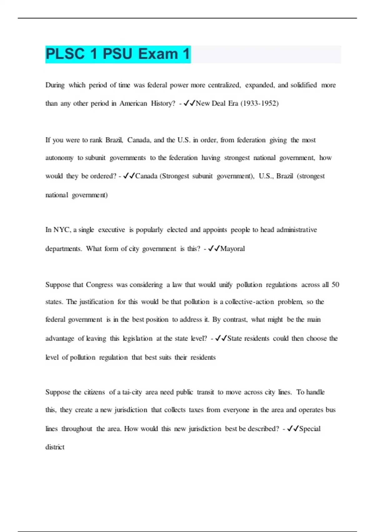 PLSC 1 PSU Exam 1 During which period of time was federal power more centralized, expanded, and solidified more than any other period in American History? - New Deal Era () If you were to rank Brazil, Canada, and the U.S. in order, from federation giving the most autonomy to subunit governments to the federation having strongest national government, how would they be ordered? - Canada (Strongest subunit government), U.S., Brazil (strongest national government) In NYC, a single executive is popularly elected and appoints people to head administrative departments. What form of city government is this? - Mayoral Suppose that Congress was considering a law that would unify pollution regulations across all 50 states. The justification for this would be that pollution is a collective-action problem, so the federal government is in the best position to address it. By contrast, what might be the main advantage of leaving this legislation at the state level? - State residents could then choose the level of pollution regulation that best suits their residents Suppose the citizens of a tai-city area need public transit to move across city lines. To handle this, they create a new jurisdiction that collects taxes from everyone in the area and operates bus lines throughout the area. How would this new jurisdiction best be described? - Special district The U.S. Department of Housing and Urban Development (HUD) offer Community Development grants, which provide states and local governments with funding to address an extensive range of community development needs. These federal grants have a general purpose but provide communities with considerable freedom in how the money is spent. Community Development grants are an example of which type of grant? - Block grant The cases of Baker v. Carr (1962) and Wesberry v. Sanders (1964) established that all electoral districts of state legislatures and the U.S. House of Representatives must be equal in size by population within state. What was an immediate consequence of these rulings? - A dramatic increase in cities' representation in Congress and the state legislatures The cases of McCulloch v. Maryland (1819) and Gibbons v. Ogden (1824) established what legal precedent? - That the national government has wide latitude to regulate commercial activity, even within the states What is dual federalism? - A political system in which each level of government - national and state - is sovereign in its own sphere of policy authority Which best describes federalism as a political system? - There are multiple levels of government, and each level has independent authority over some important policy areas Which of the following Supreme Court cases represents a centralization of federal power (a strengthening of the national government) as opposed to a decentralization of federal power (a strengthening of state sovereignty and power)? - Gibbons v. Ogden (1824) Which of the following clauses in the Constitution gives Congress the authority to make whatever laws are "necessary and proper" in order to execute its enumerated powers? - Elastic clause Which of the following is an example of a ballot initiative? - A group of citizens proposing a law legalizing marijuana, which the public then votes on in an election Which of the following is an example of intergovernmentalism failure? - The federal and state governments' response to the damage from Hurricane Katrina Which of the following is the best example of a national-level policy serving as a response to a collective-action dilemma among states? - Constructing the interstate highway system Which of the following laws gave the United States Department of Justice the power to oversee elections in southern states? - Voting