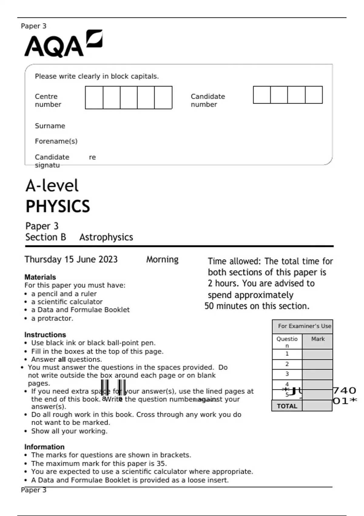 AQA A-level PHYSICS Question Paper 3 Section B Astrophysics June 2023