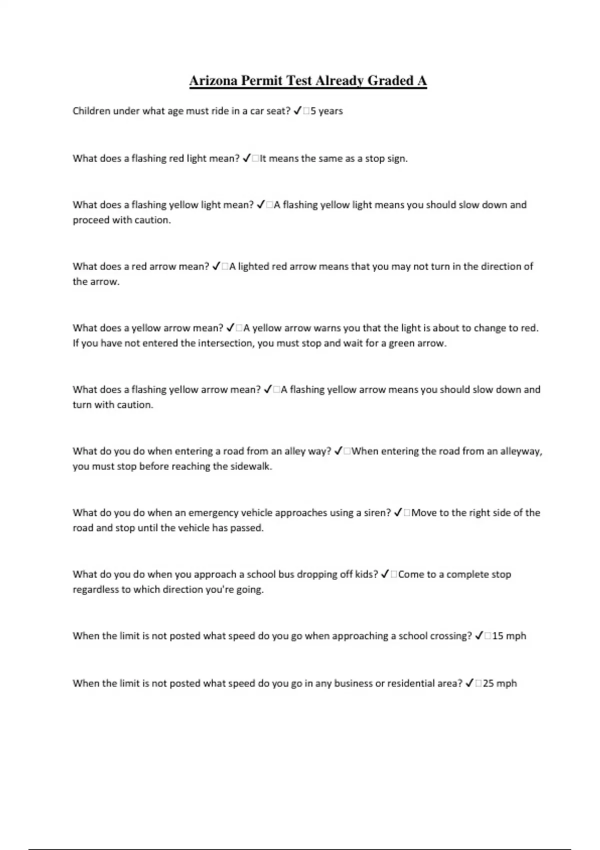 Arizona Permit Test Already Graded A Children under what age must ride in a car seat? ️5 years What does a flashing red light mean? ️It means the same as a stop sign. What does a flashing yellow light mean? ️A flashing yellow light means you should slow down and proceed with caution. What does a red arrow mean? ️A lighted red arrow means that you may not turn in the direction of the arrow. What does a yellow arrow mean? ️A yellow arrow warns you that the light is about to change to red. If you have not entered the intersection, you must stop and wait for a green arrow. What does a flashing yellow arrow mean? ️A flashing yellow arrow means you should slow down and turn with caution. What do you do when entering a road from an alley way? ️When entering the road from an alleyway, you must stop before reaching the sidewalk. What do you do when an emergency vehicle approaches using a siren? ️Move to the right side of the road and stop until the vehicle has passed. What do you do when you approach a school bus dropping off kids? ️Come to a complete stop regardless to which direction you're going. When the limit is not posted what speed do you go when approaching a school crossing? ️15 mph When the limit is not posted what speed do you go in any business or residential area? ️25 mph When the limit is not posted what speed do you go on open highways or city freeways? ️55 mph When the limit is not posted what speed do you go on designated open highways? ️65 mph. When the limit is not posted what speed do you go on rural interstate highways? ️75 mph What do you do when driving on wet roads? ️Slow down When driving in a dust storm... ️Slow down, pull over to the right, take your foot off the breaks, wait for dust storm to pass. What does a diamond shape sign mean? ️Danger ahead ▶️ ️No passing zone What do broken yellow lines mean? ️Passing on the left is permitted when the roadway is clear. What do broken yellow lines and a solid line mean? ️Passing is only permitted in one direction.