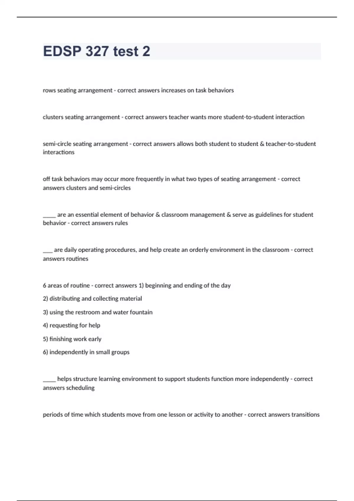EDSP 327 test 2 Questions with complete solution 2024 rows seating arrangement - correct answers increases on task behaviors clusters seating arrangement - correct answers teacher wants more student-to-student interaction semi-circle seating arrangement - correct answers allows both student to student & teacher-to-student interactions off task behaviors may occur more frequently in what two types of seating arrangement - correct answers clusters and semi-circles ____ are an essential element of behavior & classroom management & serve as guidelines for student behavior - correct answers rules ___ are daily operating procedures, and help create an orderly environment in the classroom - correct answers routines 6 areas of routine - correct answers 1) beginning and ending of the day 2) distributing and collecting material 3) using the restroom and water fountain 4) requesting for help 5) finishing work early 6) independentl
