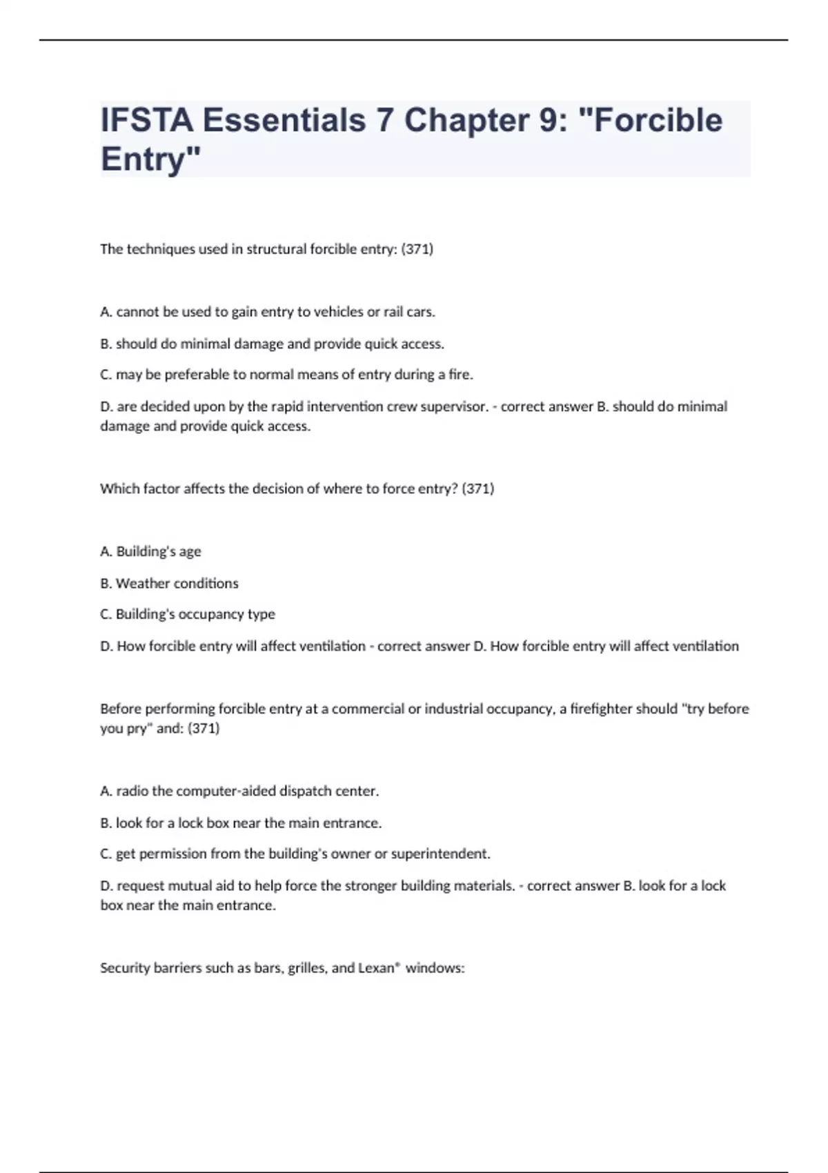 IFSTA Essentials 7 Chapter 9 Forcible Entry Exam Questions 2024. The techniques used in structural forcible entry: (371) A. cannot be used to gain entry to vehicles or rail cars. B. should do minimal damage and provide quick access. C. may be preferable to normal means of entry during a fire. D. are decided upon by the rapid intervention crew supervisor. - correct answer B. should do minimal damage and provide quick access. Which factor affects the decision of where to force entry? (371) A. Building's age B. Weather conditions C. Building's occupancy type D. How forcible entry will affect ventilation - correct answer D. How forcible entry will affect ventilation Before performing forcible entry at a commercial or industrial occupancy, a firefighter should "try before you pry" and: (371) A. radio the computer-aided dispatch center. B. look for a lock box near the main entrance. C. get permission from the building's owner or superintendent. D. request mutual aid to help force the stronger building materials. - correct answer B. look for a lock box near the main entrance. Security barriers such as bars, grilles, and Lexan® windows: