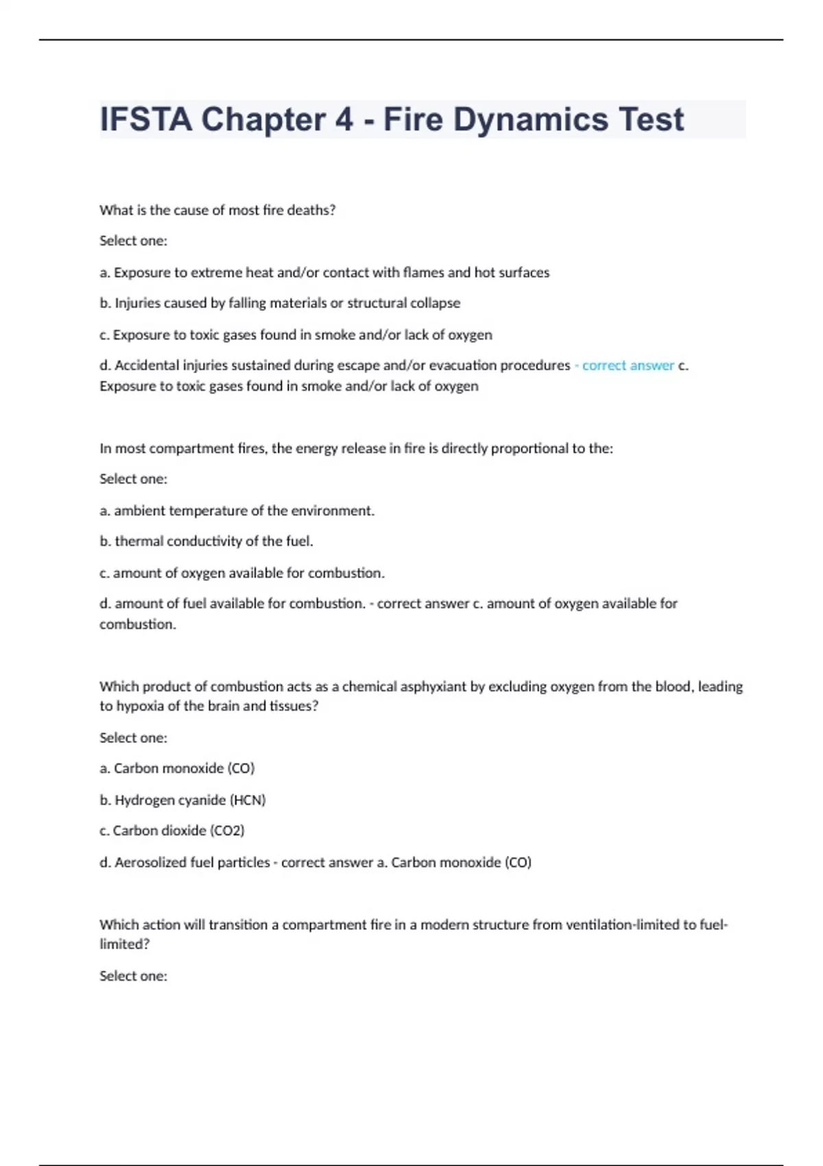 IFSTA Chapter 4 - Fire Dynamics Test With Correct Answers 2024. What is the cause of most fire deaths? Select one: a. Exposure to extreme heat and/or contact with flames and hot surfaces b. Injuries caused by falling materials or structural collapse c. Exposure to toxic gases found in smoke and/or lack of oxygen d. Accidental injuries sustained during escape and/or evacuation procedures - correct answer c. Exposure to toxic gases found in smoke and/or lack of oxygen In most compartment fires, the energy release in fire is directly proportional to the: Select one: a. ambient temperature of the environment. b. thermal conductivity of the fuel. c. amount of oxygen available for combustion. d. amount of fuel available for combustion. - correct answer c. amount of oxygen available for combustion. Which product of combustion acts as a chemical asphyxiant by excluding oxygen from the blood, leading to hypoxia of the brain and tissues? Select one: a. Carbon monoxide (CO) b. Hydrogen cyanide (HCN) c. Carbon dioxide (CO2) d. Aerosolized fuel particles - correct answer a. Carbon monoxide (CO) Which action will transition a compartment fire in a modern structure from ventilation-limited to fuel-limited? Select one: