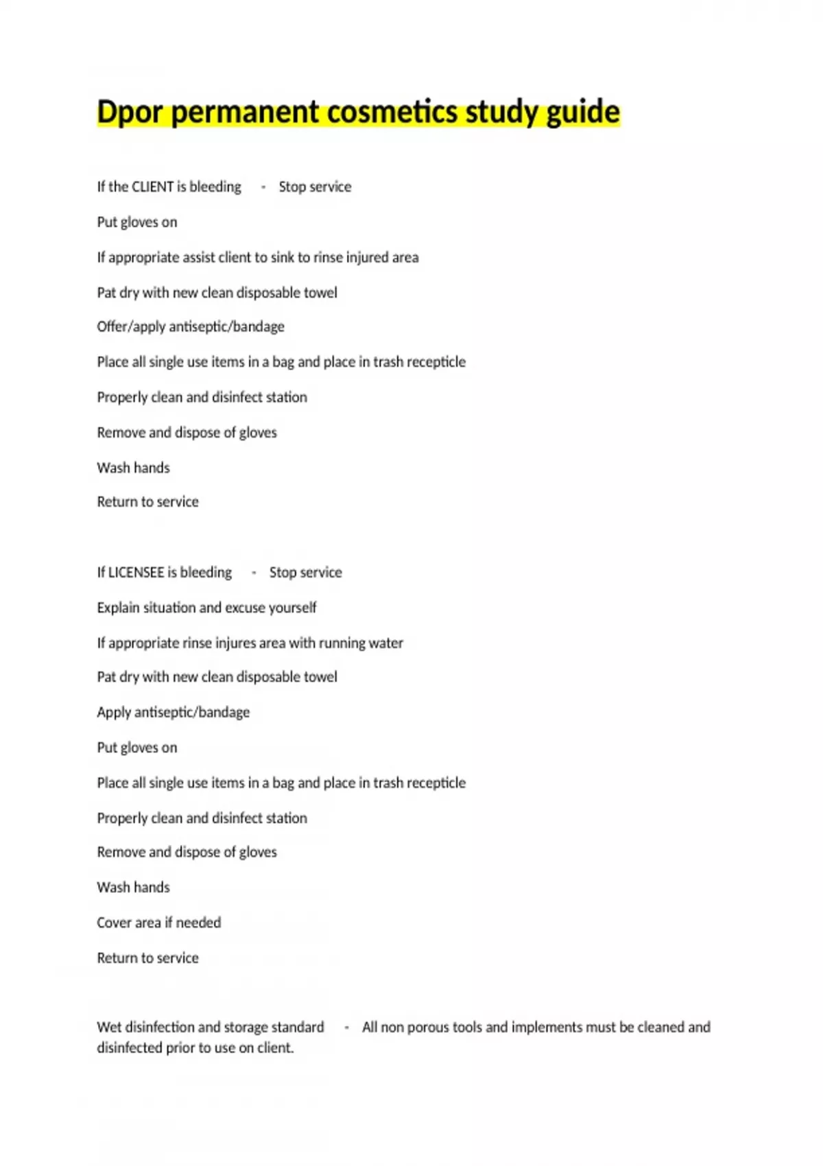 If the CLIENT is bleeding - Stop service Put gloves on If appropriate assist client to sink to rinse injured area Pat dry with new clean disposable towel Offer/apply antiseptic/bandage Place all single use items in a bag and place in trash recepticle Properly clean and disinfect station Remove and dispose of gloves Wash hands Return to service If LICENSEE is bleeding - Stop service Explain situation and excuse yourself If appropriate rinse injures area with running water Pat dry with new clean disposable towel Apply antiseptic/bandage Put gloves on Place all single use items in a bag and place in trash recepticle Properly clean and disinfect station Remove and dispose of gloves Wash hands Cover area if needed Return to service Wet disinfection and storage standard - All non porous tools and implements must be cleaned and disinfected prior to use on client. Soap and warm water or a chemical cleaner Must then be disinfected by complete immersion in an EPA registered disinfectant Porous items - Unable to be disinfected and must be disposed of after each use Dry storage standard - Disinfected items must be stored in a dry disinfected covered container and be isolated from contaminants Hand washing - Wash your hands and lower arms thoroughly when finished with activity. Use antibacterial soap and warm water. Rinse well. Acute - New, usually of rapid onset and of concern, opposite of chronic AIDS - acquired immune deficiency syndrome analgesic - drug that relieves pain