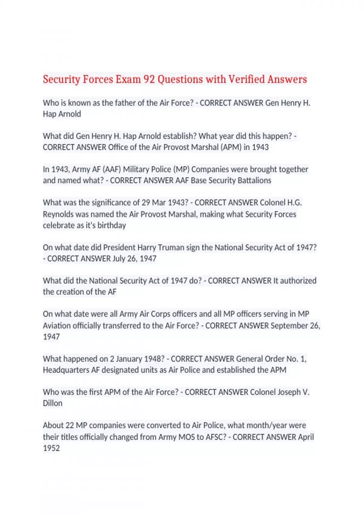 Security Forces Exam 92 Questions with Verified Answers Who is known as the father of the Air Force? - CORRECT ANSWER Gen Henry H. Hap Arnold What did Gen Henry H. Hap Arnold establish? What year did this happen? - CORRECT ANSWER Office of the Air Provost Marshal (APM) in 1943 In 1943, Army AF (AAF) Military Police (MP) Companies were brought together and named what? - CORRECT ANSWER AAF Base Security Battalions What was the significance of 29 Mar 1943? - CORRECT ANSWER Colonel H.G. Reynolds was named the Air Provost Marshal, making what Security Forces celebrate as it's birthday On what date did President Harry Truman sign the National Security Act of 1947? - CORRECT ANSWER July 26, 1947 What did the National Security Act of 1947 do? - CORRECT ANSWER It authorized the creation of the AF On what date were all Army Air Corps officers and all MP officers serving in MP Aviation officially transferred to the Air Force? - CORRECT ANSWER September 26, 1947 What happened on 2 January 1948? - CORRECT ANSWER General Order No. 1, Headquarters AF designated units as Air Police and established the APM Who was the first APM of the Air Force? - CORRECT ANSWER Colonel Joseph V. Dillon About 22 MP companies were converted to Air Police, what month/year were their titles officially changed from Army MOS to AFSC? - CORRECT ANSWER April 1952 During the Korean War Era, what experiences led to the decision that the AF needed to develop a more extensive base defense capability? - CORRECT ANSWER Early in the war, American/South Korean forces were ill prepared and were forced to fall back, which left Air Police to be to only armed forces on the bases in forward areas On what date was the first Air Police School? Where was it located? - CORRECT ANSWER 1 September 1950 at Tyndall AFB, FL Where was the Air Police school transferred to from Tyndall AFB? - CORRECT ANSWER Parks AFB, CA On what date was the Air Police training transferred to Lackland AFB, TX? - CORRECT ANSWER 13 October 1956 In the 1960's, the name APM was dropped in favor of what name? - CORRECT ANSWER Director of Security and Law Enforcement Who was the first Air Policeman killed in action during the Vietnam Conflict? On what date did this happen? - CORRECT ANSWER SSgt Terrance Jensen on 1 July 1965 Describe how SSgt Terrance Jensen was KIA - CORRECT ANSWER At Da Nang Air Base in 1965 SSgt Jensen was conducting post checks on troops who were working isolated posts at night, when he and A1C Albert Handy were surprised by a small force of saboteurs. His death lead to canine teams being tested in the war In what year was the name changed from Air Police to Security Police? - CORRECT ANSWER 1966 What was Operation Safe Side? - CORRECT ANSWER An effort to bolster protection of air bases in 1967 by training Security Police in light infantry tactics and special weapons. Many of the lessons learned during this time are the basis of today's Force Protection doctrine What was significant about the 1041st Security Police Squadron? - CORRECT ANSWER Through Operation Safe Side, this squadron was formed to undergo extensive base defense training in SE Asia, and then were deployed to Phu Cat Air Base in Vietnam where they established posts, conducted recon and ambush patrols, and provided response forces What date was the Battle of Tan Son Nhut? - CORRECT ANSWER January 31, 1968 Give a brief description of the Battle of Tan Son Nhut. - CORRECT ANSWER During the Vietnam war, on the Vietnam Tet Offensive holiday when absolutely no fighting was to be expected, 2500 enemy troops attacked Tan Son Nhut Air Base where they made entry through the west fence line, but were eventually made to retreat. What was the significance of Bunker 051 in the Battle of Tan Son Nhut? - CORRECT ANSWER A 5 man team in Bunker 051 held off enemy assault long enough to backup forces to respond and prevent further penetration of the base. Four out of the five men died but saved countless others Who were the 5 men of Bunker 051? - CORRECT ANSWER Sergeants Louis Fisher, William Cry, Charles Hebron, Roger Mills, and Alonzo Collins (the only survivor) What did the Vietnam Conflict (and more specifically the Battle of Tan Son Nhut) point out the need for change in regards to base security? - CORRECT ANSWER A whole base protective system as needed, rather than one centered solely on weapons systems When was the career field divided into 2 separate specialties? What were those 2 specialties? - CORRECT ANSWER March 1971; Security and Law Enforcement When were the first women (12 of them) to enter the Law Enforcement Specialist Training at the Security Police Academy at Lackland AFB, TX - CORRECT ANSWER November 1971 When was the first high priority rescue mission Security Police were tasked with executing? What was the mission and what was the outcome? - CORRECT ANSWER May 1975; They were tasked to recapture the S.S. Mayaguez merchant ship which was seized by communist forces in Cambodia. The helicopter that was transporting them crashed and all 18 SP's were killed. What were developed and staged throughout Europe during the period from 1981 to 1989? - CORRECT ANSWER Ground Launched Cruise Missiles (GLCM) Give a brief description of Operation Urgent Fury. - CORRECT ANSWER In 1983, the Cuban government was using Grenada (an independent nation in the Caribbean Islands) as a holding place for arms and military equipment. The response was a multinational effort in which Security Police were tasked with securing landing strips and controlling Enemy Prisoners of War. Give a brief description of Operation Just Cause. - CORRECT ANSWER U.S. invasion of Panama in December 1989 to bring an end to the nation's dictatorship. Security Police were tasked with securing landing strips, drug interdiction, and humanitarian relief. When did Operation Desert Shield begin? What was the objective? - CORRECT ANSWER August 1990; The defense of Saudi Arabia in the wake of the invasion of Kuwait by Iraq When did Operation Dese