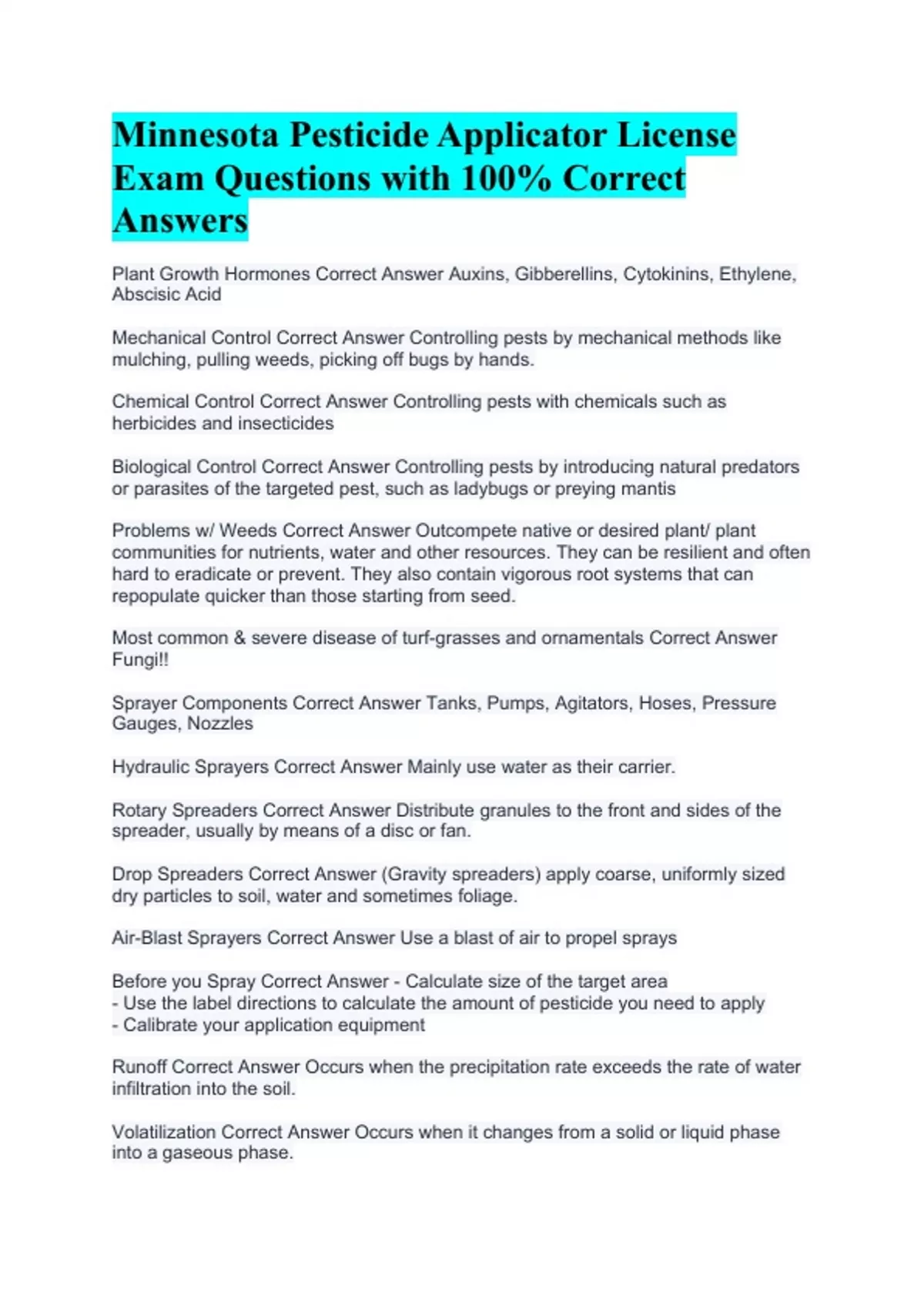 Minnesota Pesticide Applicator License Exam Questions with 100% Correct Answers Plant Growth Hormones Correct Answer Auxins, Gibberellins, Cytokinins, Ethylene, Abscisic Acid