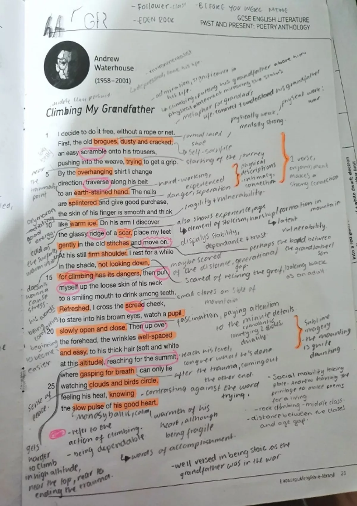 This is a fully annotated poem of climbing my grandfather used in the english literature . the notes were made in class, so they're easy to understand and they were used to achieve a grade 9
