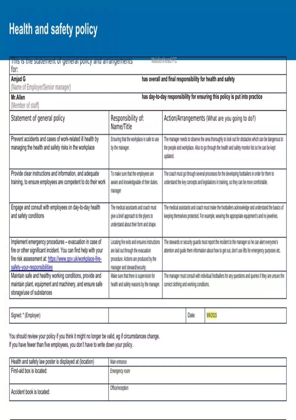 Maintain safe and healthy working conditions, provide and Make sure that there is supervision for The manager must consult with individual footballers for any questions and queries if they are unsure the