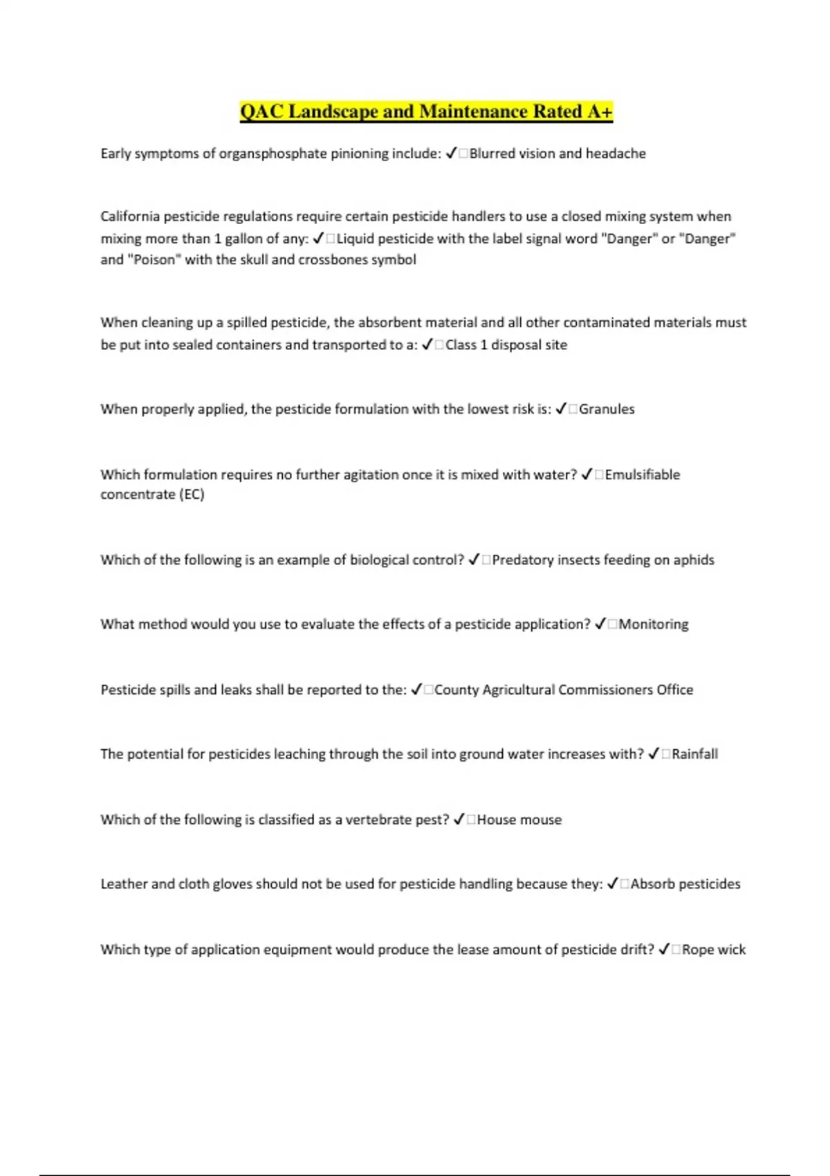 QAC Landscape and Maintenance Rated A+ Early symptoms of organsphosphate pinioning include: ️Blurred vision and headache California pesticide regulations require certain pesticide handlers to use a closed mixing system when mixing more than 1 gallon of any: ️Liquid pesticide with the label signal word "Danger" or "Danger" and "Poison" with the skull and crossbones symbol When cleaning up a spilled pesticide, the absorbent material and all other contaminated materials must be put into sealed containers and transported to a: ️Class 1 disposal site When properly applied, the pesticide formulation with the lowest risk is: ️Granules Which formulation requires no further agitation once it is mixed with water? ️Emulsifiable concentrate (EC) Which of the following is an example of biological control? ️Predatory insects feeding on aphids What method would you use to evaluate the effects of a pesticide application? ️Monitoring Pesticide spills and leaks shall be reported to the: ️County Agricultural Commissioners Office The potential for pesticides leaching through the soil into ground water increases with? ️Rainfall Which of the following is classified as a vertebrate pest? ️House mouse Leather and cloth gloves should not be used for pesticide handling because they: ️Absorb pesticides Which type of application equipment would produce the lease amount of pesticide drift? ️Rope wick Which type of weeds are most difficult to control with herbicides? ️Perennials A persistent pesticide is one that: ️Remains in its active state in the environment for long periods Which of the following types of plant disorders cannot be transmitted from one plant to another? ️Abiotic Pesticide applications in interiorscape situations involve treating either: ️Above ground parts or growing medium Constant use of insecticides on turf or in landscaped areas could lead to: ️Disruption of natural enemies An important reason to inspect the area where you will be completing a pesticide application is to: ️Identify any hazardous situations Commonly, pesticides incompatibility can be observed in the spray tank by: ️Clumping or separation of the mixture When applying most pesticides, the way to avoid breathing toxic vapors is to use a: ️Chemical or cartage respirator It takes your equipment 3 minutes to travel 264 feet. How fast, in miles per hour, is the equipment traveling? ️1 mile per hour The surfaces of objects that are commonly present in interiorscapes during a pesticide application might become etched can be caused by the: ️Inert ingredients Employee handler pesticide safety training topics do NOT include hoe to: ️Recognize the chemical characteristics of the pesticide To increase the uniformity of spray droplets: ️Use nozzles designed for the working pressure of your sprayer One advantage of using ready to use pesticides formulation is: ️No mixing is required By increasing the nozzle office you will produce: ️Larger droplets Which type of herbicide would you use on a lawn where you need to control annual weeds? ️Pre emergent herbicide Before applying a pesticide, you must verify: ️The application equipment, to make sure it is working well An applicators sprayer with a 30 gallon tank will cover 1.25 acres. The applicator plans to apply a pesticide at a label rate of 1.5 pounds per acre. How much of this pesticide will you need? ️1.25 acres/tank x 1.5 lbs/acre=1.875 When using poisoned baits for controlling vertebrate pests, you should: ️Place them into tamper resistant bait stations A drawback of using common names instead of scientific names for identifying pest is: ️Common