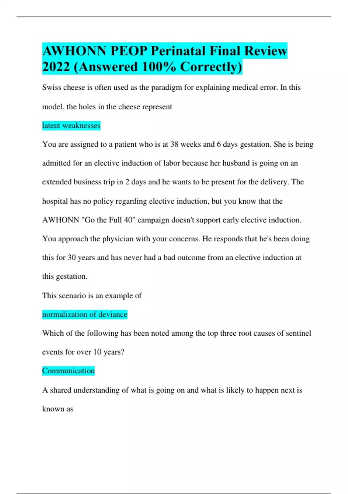 AWHONN PEOP Perinatal Final Review 2022 (Answered 100% Correctly)