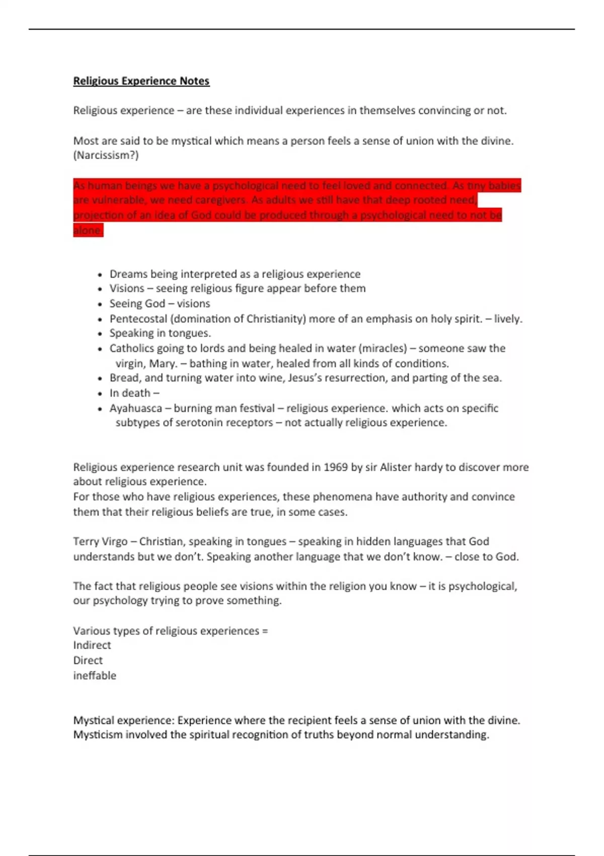 Summary Religious Experience Notes