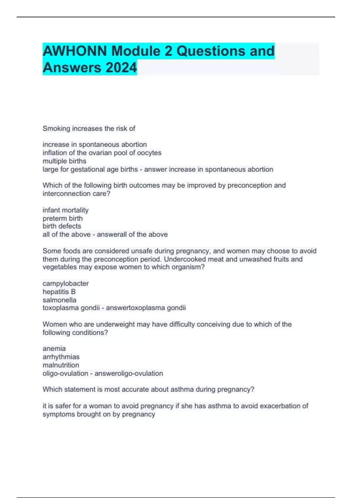 AWHONN Module 2 Questions and Answers 2024 Smoking increases the risk of increase in spontaneous abortion inflation of the ovarian pool of oocytes multiple births large for gestational age births increase in spontaneous abortion Which of the following birth outcomes may be improved by preconception and interconception care? infant mortality preterm birth birth defects all of the above all of the above Brainpower Read More Previous Play Next Rewind 10 seconds Move forward 10 seconds Unmute 0:00 / 0:15 Full screen Some foods are considered unsafe during pregnancy, and women may choose to avoid them during the preconception period. Undercooked meat and unwashed fruits and vegetables may expose women to which organism? campylobacter hepatitis B salmonella toxoplasma gondii toxoplasma gondii Women who are underweight may have difficulty conceiving due to which of the following conditions? anemia arrhythmias malnutrition oligo-ovulation oligo-ovulation Which statement is most accurate about asthma during pregnancy? it is safer for a woman to avoid pregnancy if she has asthma to avoid exacerbation of symptoms brought on by pregnancy it is safer for a pregnant woman to be treated with asthma medications than to have associated symptoms and exacerbated asthma it is safer for a pregnant woman to ingest asthma medications only asthma attacks it is safer for a woman with asthma to stay at home throughout her pregnancy it is safer for a pregnant woman to be treated with asthma medications than to have associated symptoms and exacerbated asthma Cultural sensitivity means that the healthcare provider is alert and considerate of others' views aware that there are other cultures in the world competent in cultures other than his/her own in a position to provide what the patient needs alert and considerate of others' views Increasing maternal and paternal age have been shown to influence the risk of preterm labor hydatidiform mole multiple gestation genetic abnormalities genetic abnormalities Women over the age of 35 have an increased risk of cesarean birth miscarriage and stillbirth pregnancy-related complications all of the above all of the above Access to care may be limited by all factors except lack of contraception medical insurance transportation trust in medical community contraception Interconception care should be provided to a woman anytime she is sexually active from first menstruation until around age 40 postpartum until she can no longer become pregnant only when she indicates she is considering another pregnancy postpartum until she can no longer become pregnant The first "a" in RADAR stands for access resources to assist in a safe escape alert authorities after hearing story about IPV allow time for gathering composure before telling story ask directly, in a kind, nonjudgmental way ask directly, in a kind, nonjudgmental way Women with chronic diseases who want to plan a pregnancy should not stop medications immediately be referred to an appropriate specialist switch to nonteratogenic medications delay conception until disease is optimized stop medications immediately All women of childbearing age should take which of the following per day to reduce the risk of neural tube defects? antacids ascorbic acid folic acid salicylic acid folic acid Healthcare providers should strive to provide preconception and interconception care to all women of childbearing age, which is generally considered to be 15-44 years of age 19-35 years of age 20-50 years of age women who request this information 15-44 years of age Depression, fatigue, weight gain, and difficulty concentrating may all be signs of which condition? cardiomyopathy diabetes hypothyroidism hyperthyroidism hypothyroidism Obese women (BMI ≥30) should gain how many pounds during pregnancy? 11-20 15-25 25-35 28-30 11-20 In nonpregnant women, obesity is defined as a body mass index (BMI) over 18 25 30 45 30 A tool used to screen for IPV is CAGE RADAR PHQ-9 Edinburgh scale RADAR