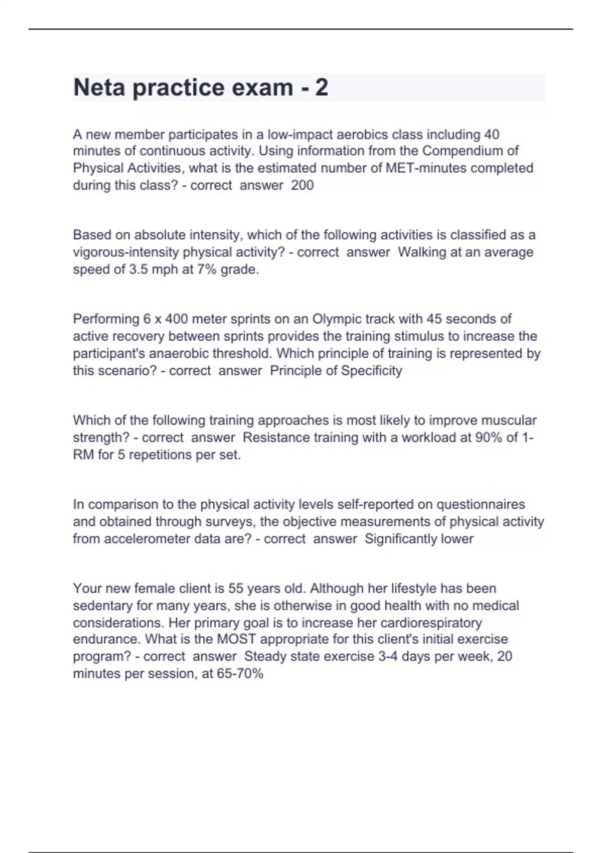 Neta Revie Practice Exam With A Pass 2024. A new member participates in a low-impact aerobics class including 40 minutes of continuous activity. Using information from the Compendium of Physical Activities, what is the estimated number of MET-minutes completed during this class? - correct answer 200 Based on absolute intensity, which of the following activities is classified as a vigorous-intensity physical activity? - correct answer Walking at an average speed of 3.5 mph at 7% grade. Performing 6 x 400 meter sprints on an Olympic track with 45 seconds of active recovery between sprints provides the training stimulus to increase the participant's anaerobic threshold. Which principle of training is represented by this scenario? - correct answer Principle of Specificity Which of the following training approaches is most likely to improve muscular strength? - correct answer Resistance training with a workload at 90% of 1-RM for 5 repetitions per set. In comparison to the physical activity levels self-reported on questionnaires and obtained through surveys, the objective measurements of physical activity from accelerometer data are? - correct answer Significantly lower Your new female client is 55 years old. Although her lifestyle has been sedentary for many years, she is otherwise in good health with no medical considerations. Her primary goal is to increase her cardiorespiratory endurance. What is the MOST appropriate for this client's initial exercise program? - correct answer Steady state exercise 3-4 days per week, 20 minutes per session, at 65-70%