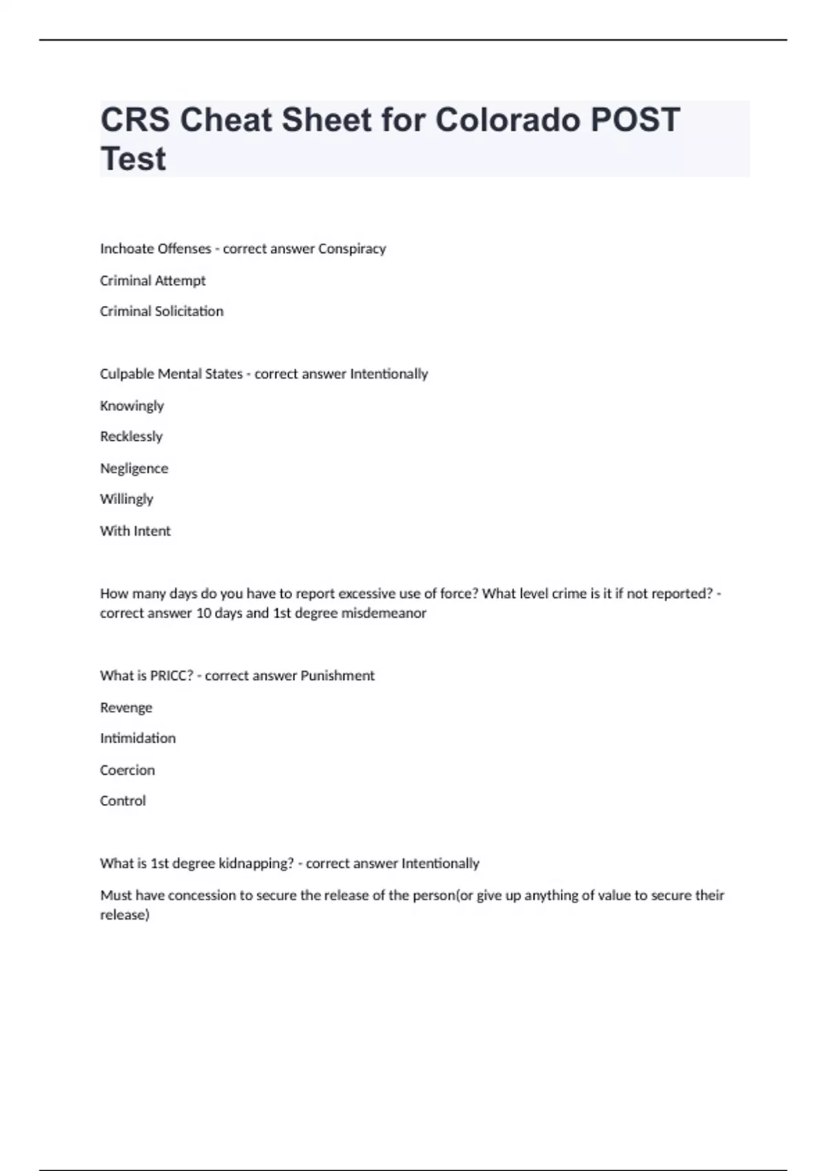 CRS Cheat Sheet for Colorado POST TestInchoate Offenses - correct answer Conspiracy Criminal Attempt Criminal Solicitation Culpable Mental States - correct answer Intentionally Knowingly Recklessly Negligence Willingly With Intent How many days do you have to report excessive use of force? What level crime is it if not reported? - correct answer 10 days and 1st degree misdemeanor What is PRICC? - correct answer Punishment Revenge Intimidation Coercion Control What is 1st degree kidnapping? - correct answer Intentionally Must have concession to secure the release of the person(or give up anything of value to secure their release)