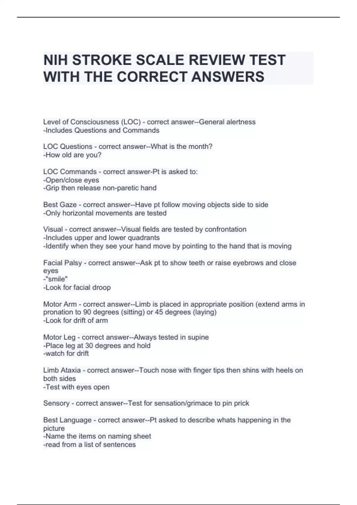 NIH STROKE SCALE REVIEW TEST WITH THE CORRECT ANSWERS