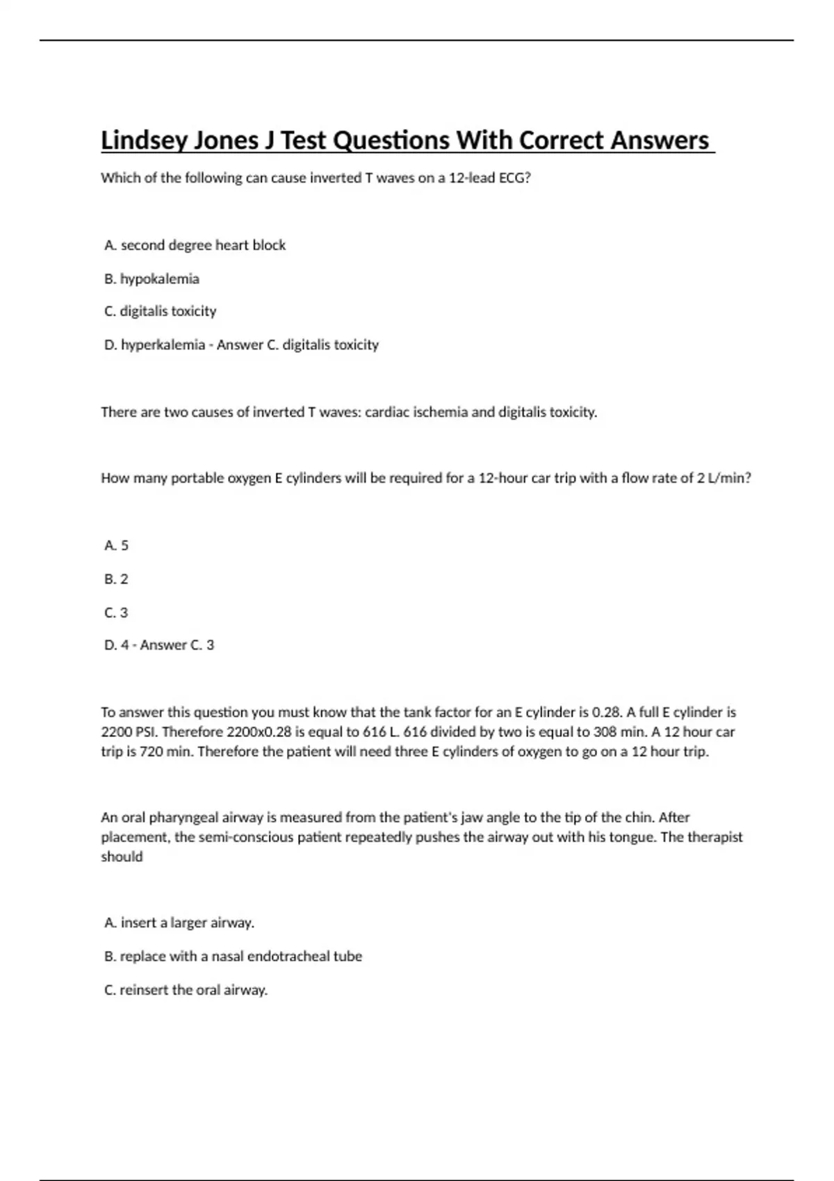 Which of the following can cause inverted T waves on a 12-lead ECG? A. second degree heart block B. hypokalemia C. digitalis toxicity D. hyperkalemia - Answer C. digitalis toxicity There are two causes of inverted T waves: cardiac ischemia and digitalis toxicity. How many portable oxygen E cylinders will be required for a 12-hour car trip with a flow rate of 2 L/min? A. 5 B. 2 C. 3 D. 4 - Answer C. 3 To answer this question you must know that the tank factor for an E cylinder is 0.28. A full E cylinder is 2200 PSI. Therefore 2200x0.28 is equal to 616 L. 616 divided by two is equal to 308 min. A 12 hour car trip is 720 min. Therefore the patient will need three E cylinders of oxygen to go on a 12 hour trip. An oral pharyngeal airway is measured from the patient's jaw angle to the tip of the chin. After placement, the semi-conscious patient repeatedly pushes the airway out with his tongue. The therapist should A. insert a larger airway. B. replace with a nasal endotracheal tube C. reinsert the oral airway. D. secure the airway with tape. - Answer C. reinsert the oral airway. It is normal for a patient to reject an oral airway with their tongue. Reinserting the airway is most appropriate. A respiratory therapist changes from a normal adult ventilator circuit to a heated-wire circuit. Arterial blood gases are as follows: pH 7.31 PaCO2 48 torr PaO2 81 torr HCO3- 24 mEq/L BE 0 mEq/L Which of the following changes is most indicated? A. increase inspiratory flow rate B. revert to the normal non-heated wire circuit C. remove 50-100 mL of deadspace between the wye and patient D. add 100 mL of deadspace at the patient-ventilator interface - Answer C. remove 50-100 mL of deadspace between the wye and patient Removing deadspace is the best option and is the only option that will reduce carbon dioxide. What also makes this appropriate is the fact that CO2 is off target by a very small amount, making a change in deadspace appropriate. A patient in the emergency room, who is breathing rapidly and deeply, is receiving heated aerosol by mask and large-volume nebulizer with FIO2 set at 1.0 and the flow set at 15 L/min. The therapist notices the aerosol disappears completely with each breath. Pulse oximetry shows an oxygen saturation of 88%. The therapist should recommend A. switch to a non-rebreathing mask at the same flow B. increase flow to 20 L/min C. decrease FIO2 to 0.6 D. a tandem aerosol device - Answer D. a tandem aerosol device A large volume nebulizer set at 60% with a flow of 15 L/min is producing a total gas flow of 15 L/min. Because this patient is breathing rapidly and deeply and is hypoxic, it is likely that the total flow is not meeting the inspiratory demands of the patient. Because the flow of the large-volume nebulizer may not be increased significantly due to back pressure the solution for this case is to add another tandem large-volume nebulizer device, producing a total gas flow of 30 L/min. A respiratory therapist is assisting in a cardiopulmonary stress testing of a patient. After several increases in workload by increasing the incline on the treadmill, heart rate is 120/min, blood pressure is 130/95 mmHg and O2 Sat is 97%. Increasing the treadmill further shows no further increase in these values, but the patient appears pale in color. The therapist should recommend A. after two minutes, increase workload B. discontinue the test, document findings C. monitor the patient closely D. decrease workload - Answer B. discontinue the test, document findings The laboratory results of a sputum culture and sensitivity have returned for a patient who has bilateral bacterial pneumonia. The culture reveals streptococcus, a gram-positive bacteria. The medical records indicates the patient is allergic to penicillin. Which of the following should the respiratory therapist recommend? A. Amoxicillin B. Cephalexine (Keflex) C. Methacillin D. Nafcillin - Answer B. Cephalexine (Keflex) Normally gram-positive bacteria may be killed by penicillin-type antibiotics. But, because the patient is allergic to penicillin, a suitable drug is cephalexine. Nafcillin and methacillin are suitable antibiotics when a patient is penicillin-resistant but not when they are allergic. A patient with cystic fibrosis develops rhonchi after 5 minutes of PEP therapy at 20 cm H2O. The respiratory therapist should A. switching to flutter therapy B. discontinue treatment, report to findings to the physician C. begin cool bland aerosol therapy D. continue the therapy - Answer D. continue the therapy The development of rhonchi in response to PEP therapy is considered to be a good outcome for the therapy. The purpose of the therapy is to mobilize and promote expectoration of secretions. The development of rhonchi is an indication that secretions are moving from small and middle-sized airways to the larger size airways where they may be naturally expectorated or suctioned. The therapy should be continued because it is effective. Excessive bubbling is noted in the water seal chamber of a chest tube drainage system. Which of the following could be the cause? A. water seal fluid level is too high B. water seal fluid level is too low C. wall pressure is too low D. leak in the drainage tubing coming from the patient - Answer D. leak in the drainage tubing coming from the patient A leak in the drainage tubing coming from a patient's chest will cause the entrainment of additional air into the system which will show up as excessive bubbling in the water-seal compartment. Normally gentle bubbling should be observed. When excessive bubbling is present, a leak most likely exists somewhere between the waterseal compartment and the patient's lung tissue and may be caused from a perforation or hole in the lung tissue. Which of the following would result in an increase in anatomical airway resistance? A. an undersized endotracheal tube B. autoPEEP C. pulmonary secretions D. water build up in the ventilator circuit - Answer C. pulmonary secretions Ai