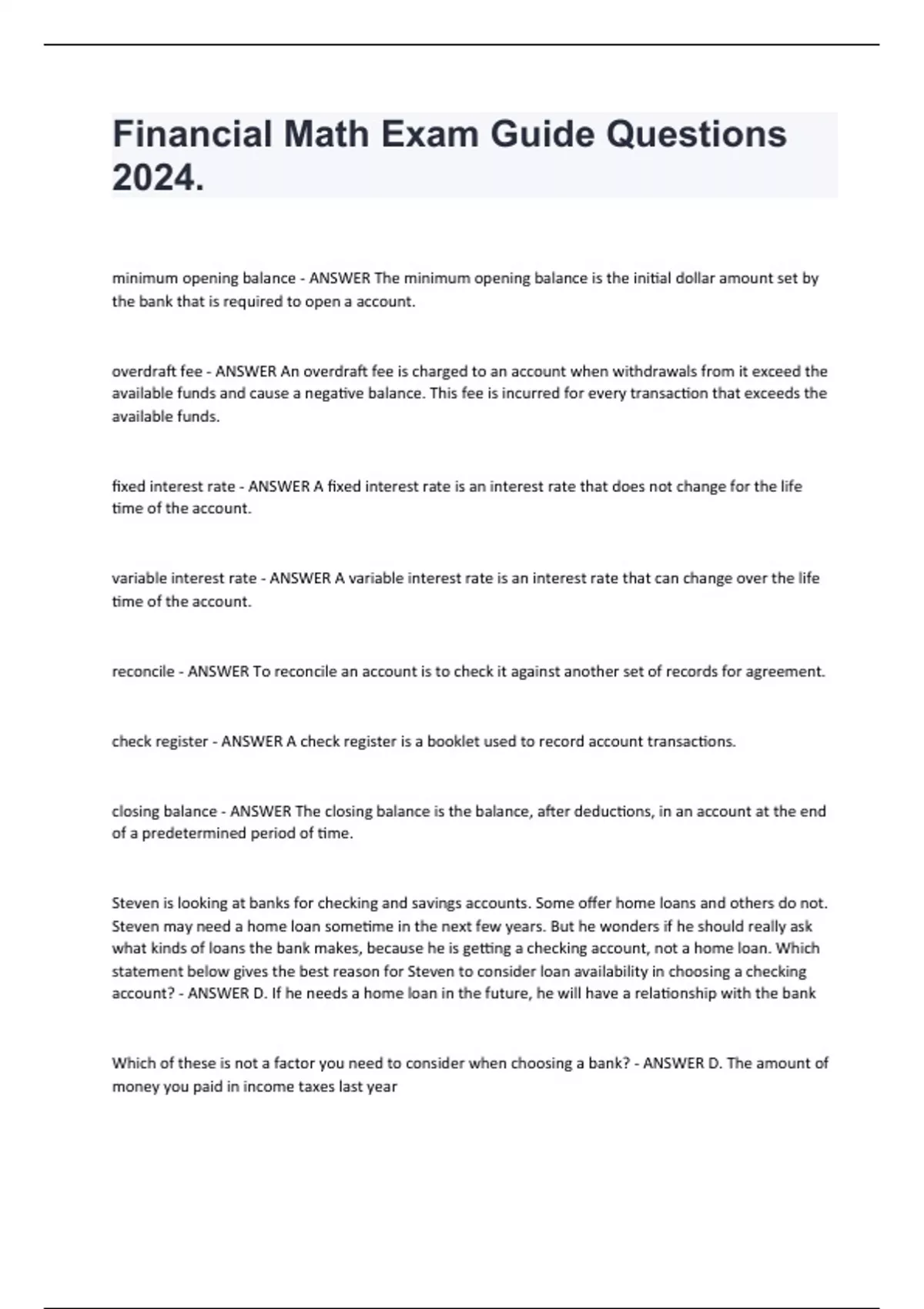 Financial Math Exam Guide Questions 2024. minimum opening balance - ANSWER The minimum opening balance is the initial dollar amount set by the bank that is required to open a account. overdraft fee - ANSWER An overdraft fee is charged to an account when withdrawals from it exceed the available funds and cause a negative balance. This fee is incurred for every transaction that exceeds the available funds. fixed interest rate - ANSWER A fixed interest rate is an interest rate that does not change for the life time of the account. variable interest rate - ANSWER A variable interest rate is an interest rate that can change over the life time of the account. reconcile - ANSWER To reconcile an account is to check it against another set of records for agreement. check register - ANSWER A check register is a booklet used to record account transactions. closing balance - ANSWER The closing balance is the balance, after deductions, in an account at the end of a predetermined period of time. Steven is looking at banks for checking and savings accounts. Some offer home loans and others do not. Steven may need a home loan sometime in the next few years. But he wonders if he should really ask what kinds of loans the bank makes, because he is getting a checking account, not a home loan. Which statement below gives the best reason for Steven to consider loan availability in choosing a checking account? - ANSWER D. If he needs a home loan in the future, he will have a relationship with the bank Which of these is not a factor you need to consider when choosing a bank? - ANSWER D. The amount of money you paid in income taxes last year
