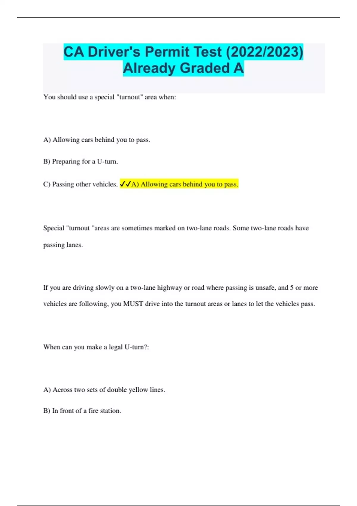 CA Driver's Permit Test (2022/2023) Already Graded A You should use a special "turnout" area when: A) Allowing cars behind you to pass. B) Preparing for a U-turn. C) Passing other vehicles. A) Allowing cars behind you to pass. Special "turnout "areas are sometimes marked on two-lane roads. Some two-lane roads have passing lanes. If you are driving slowly on a two-lane highway or road where passing is unsafe, and 5 or more vehicles are following, you MUST drive into the turnout areas or lanes to let the vehicles pass. When can you make a legal U-turn?: A) Across two sets of double yellow lines. B) In front of a fire station.