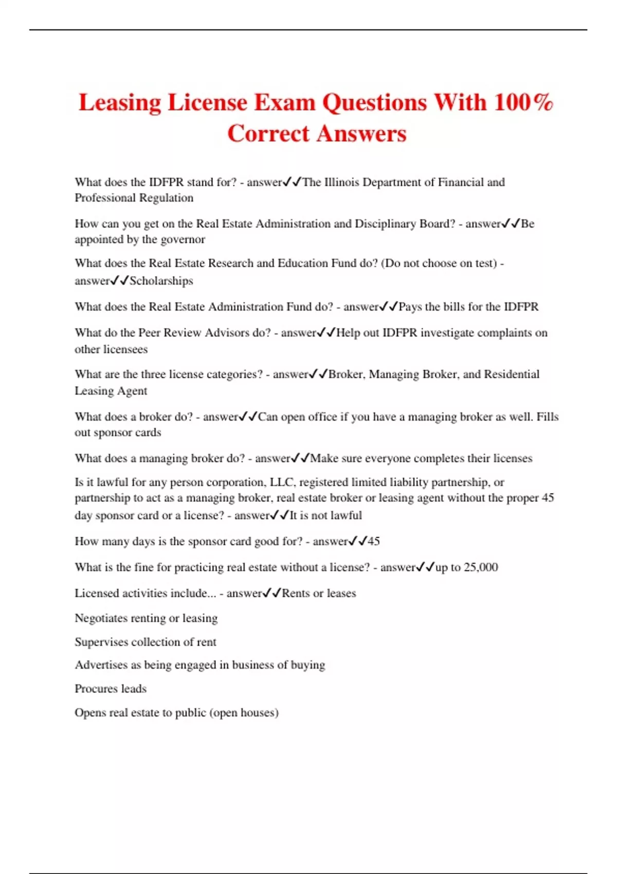 Leasing License Exam Questions With 100% Correct Answers What does the IDFPR stand for? - answerThe Illinois Department of Financial and Professional Regulation How can you get on the Real Estate Administration and Disciplinary Board? - answerBe appointed by the governor What does the Real Estate Research and Education Fund do? (Do not choose on test) - answerScholarships What does the Real Estate Administration Fund do? - answerPays the bills for the IDFPR What do the Peer Review Advisors do? - answerHelp out IDFPR investigate complaints on other licensees What are the three license categories? - answerBroker, Managing Broker, and Residential Leasing Agent What does a broker do? - answerCan open office if you have a managing broker as well. Fills out sponsor cards What does a managing broker do? - answerMake sure everyone completes their licenses Is it lawful for any person corporation, LLC, registered limited liability partnership, or partnership to act as a managing broker, real estate broker or leasing agent without the proper 45 day sponsor card or a license? - answerIt is not lawful How many days is the sponsor card good for? - answer45 What is the fine for practicing real estate without a license? - answerup to 25,000 Licensed activities include... - answerRents or leases Negotiates renting or leasing Supervises collection of rent Advertises as being engaged in business of buying Procures leads Opens real estate to public (open houses) What is a brokerage agreement? - answerA written or oral agreement between a sponsoring broker and a consumer for licensed activities in return for compensation What is a client? - answerA person who is being represented by a licensee What is compensation? - answerThe valuable consideration given by one person to another person in exchange for performance.Can only be paid out by broker Leasing agents may perform... - answerLeasing or renting of residential property, offer or negotiate to rent or lease a property, and collect rent or supervise collection What happens to sponsored licenses if their sponsor's license gets revoked? - answerImmediately goes inactive What are the violations for practicing unlicensed real estate and how long do you have to pay your fine? - answerClass A misdemeanor Class 4 Felony $25,000 60 days What can an unlicensed assistant do? - answerDraft ad copies and promotional materials that are approved Place advertising Place signs on property Routine calls on late payments Sit at a property for broker that is not open to public What can an unlicensed assistant not do? - answerHost open houses that are open to the public Explain contracts What are the exemptions for the license requirement? - answerAn owner Attorney Receiver or executor Resident manager Federal agency State government Railroads Resident of a residential dwelling unit What are the terms of a resident of a residential dwelling unit? - answerRefers no more than 3 lessees in a 12 month period Received compensation no more than 5k or equivalent of two months rent whichever is less Requirements to be eligible for leasing agent license - answer18 years or older Have a good moral character High school diploma or GED Have a sponsoring broker 15 hours of leasing class Pass written state exam Who gets the 120 day temporary agent student permit? - answerLeasing agents only Who can get a 45 day sponsor card? - answerLeasing agents, managing brokers, and brokers How often can an unlicensed residential leasing agent practice as a student for? - answerOnce every 24 months Example: Can fill out the permit with a company and leave but them wait two years for another temporary When can a sponsoring broker issue a 45 day sponsor card? - answerPresentation of... Passing score on exam Original license License expired less than 2 years Upon termination of employment by the sponsoring broker they shall - answerNotify terminated licensee within 24 hours notify IDFPR Upon termination of employment by the licensee they shall - answerNotify IDFPR within 24 hours All leasing agent licenses expire on... - answerJuly 31st on even years Describe a branch loacation - answerAny property that the broker manager/leases that has an office onside, records stored there, and conducts licensed activities How long do you have to report any changes in managing brokers? - answer15 days Can an office be located in a retail or financial business? - answerNo