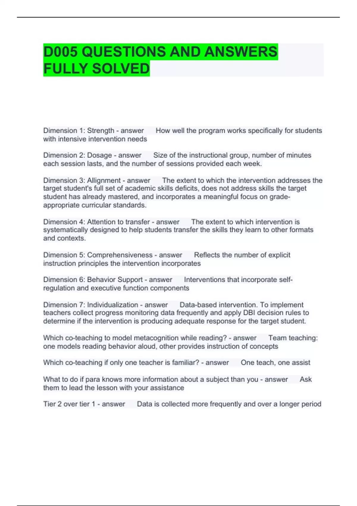 D005 QUESTIONS AND ANSWERS FULLY SOLVED Dimension 1: Strength How well the program works specifically for students with intensive intervention needs Dimension 2: Dosage Size of the instructional group, number of minutes each session lasts, and the number of sessions provided each week. Dimension 3: Allignment The extent to which the intervention addresses the target student's full set of academic skills deficits, does not address skills the target student has already mastered, and incorporates a meaningful focus on grade-appropriate curricular standards. Dimension 4: Attention to transfer The extent to which intervention is systematically designed to help students transfer the skills they learn to other formats and contexts. Dimension 5: Comprehensiveness Reflects the number of explicit instruction principles the intervention incorporates Dimension 6: Behavior Support Interventions that incorporate self-regulation and executive function components Dimension 7: Individualization Data-based intervention. To implement teachers collect progress monitoring data frequently and apply DBI decision rules to determine if the intervention is producing adequate response for the target student. Which co-teaching to model metacognition while reading? Team teaching: one models reading behavior aloud, other provides instruction of concepts Which co-teaching if only one teacher is familiar? One teach, one assist What to do if para knows more information about a subject than you Ask them to lead the lesson with your assistance Tier 2 over tier 1 Data is collected more frequently and over a longer period What needs to happen before changes are made to tier 1 Is the instruction high quality and scientifically based How effective the intervention should be for a student in achieving a goal Strength Tier 2 student is still not making progress after test they intensified intervention time what did they do? Data-based intervention and individualization Reviewing an outline. SCREAM? Structure Main points of lesson highlighted on outline. SCREAM? Structure Systematic instruction Teaching lessons and activities in a logical fashion Prompts students with previous information to make sure they are retaining Material reviews When we arrive remember to use polite behaviors. If you need help what do you do? Generalized practice skills Sky write, finger on table, pencil paper Multiple examples of stimulus Which strategy for improving attention involves limiting direct instruction and has students engage in activities? Student activites Aide provided with food to help them pay attention Extreme attention deficit strategy Adding more affirmations Positive feelings toward contentq Imagery to learn sizes of animals Improving memory Information to decide how students are assigned an academic task Developing background knowledge through class discussion Provide explicit instruction of how to plan and evaluate one's own learning Model it Rehearsal strategies to use for mastering larger concepts Memorizing bits of information Demonstrating self-talk Establishing independent practice Enthusiasm Use an upbeat tone of voice, rapid presentation rate, and varied inflection Structure Discuss with the students the purpose of the lesson. Display for the students an outline of the lesson. Emphasize the critical points of the lesson. Summarize and review throughout the lesson. Maximized engagement Select material that is at the correct level of difficulty. Select material that is motivating and interesting. Use effective positioning techniques. Provide helpful feedback. Praise students frequently. Redundancy Continue to reemphasize key concepts, procedures, and rules during the lesson. This is critical to the success of the students.