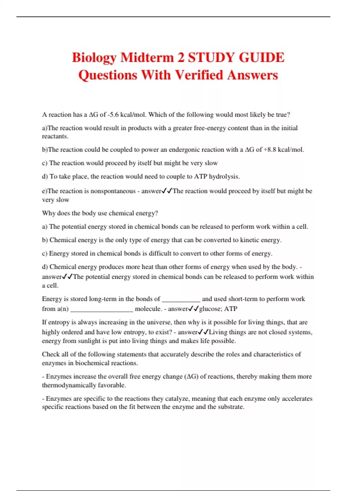 Biology Midterm 2 STUDY GUIDE Questions With Verified Answers A reaction has a ∆G of -5.6 kcal/mol. Which of the following would most likely be true? a)The reaction would result in products with a greater free-energy content than in the initial reactants. b)The reaction could be coupled to power an endergonic reaction with a ∆G of +8.8 kcal/mol. c) The reaction would proceed by itself but might be very slow d) To take place, the reaction would need to couple to ATP hydrolysis. e)The reaction is nonspontaneous - answerThe reaction would proceed by itself but might be very slow Why does the body use chemical energy? a) The potential energy stored in chemical bonds can be released to perform work within a cell. b) Chemical energy is the only type of energy that can be converted to kinetic energy. c) Energy stored in chemical bonds is difficult to convert to other forms of energy. d) Chemical energy produces more heat than other forms of energy when used by the body. - answerThe potential energy stored in chemical bonds can be released to perform work within a cell. Energy is stored long-term in the bonds of ___________ and used short-term to perform work from a(n) __________________ molecule. - answerglucose; ATP If entropy is always increasing in the universe, then why is it possible for living things, that are highly ordered and have low entropy, to exist? - answerLiving things are not closed systems, energy from sunlight is put into living things and makes life possible. Check all of the following statements that accurately describe the roles and characteristics of enzymes in biochemical reactions. - Enzymes increase the overall free energy change (ΔG) of reactions, thereby making them more thermodynamically favorable. - Enzymes are specific to the reactions they catalyze, meaning that each enzyme only accelerates specific reactions based on the fit between the enzyme and the substrate. - Enzymes reduce the activation energy required for a reaction to proceed, but do not alter the overall free energy change (ΔG) of the reaction. - Enzymes can change an endergonic reaction (ΔG0) into an exergonic reaction (ΔG0) by altering the reactants and products. - Enzymes are consumed in the reactions they catalyze and must be regenerated in subsequent reactions. - answer- Enzymes are specific to the reactions they catalyze, meaning that each enzyme only accelerates specific reactions based on the fit between the enzyme and the substrate. - Enzymes reduce the activation energy required for a reaction to proceed, but do not alter the overall free energy change (ΔG) of the reaction. Which type of metabolic pathway uses energy to take small molecules and assemble them into larger ones? Hydraulic Synthetic Catabolic Anabolic - answerAnabolic Which of the following are TRUE about enzymes? (Select all that apply) Change the free energy of a reaction Are used up by a reaction and can only be used once. Convert a reaction from endergonic to exergonic Change the activation energy of a reaction Catalyze chemical reactions Are proteins - answer- Change the activation energy of a reaction - Catalyze chemical reactions - Are proteins Which of the following has positive ΔG ? (select all that apply) - a reaction where the net change in free energy makes some of that energy available to do work - a reaction where the products have more free energy than the reactants - burning wood - an exergonic reaction - an endergonic reaction - answer- a reaction where the products have more free energy than the reactants - an endergonic reaction Which of the following reactions is endergonic? C6H12O6 + 6 O2 → 6 CO2 + 6 H2O 6 CO2 + 6 H2O → C6H12O6 + 6 O2 ATP + glucose → ADP + Pi + glucose-6-phosphate ATP → ADP + Pi - answer6 CO2 + 6 H2O → C6H12O6 + 6 O2 Which of the following reactions is exergonic? C6H12O6 + 6 O2 → 6 CO2 + 6 H2O 6 CO2 + 6 H2O → C6H12O6 + 6 O2 ATP + glucose → ADP + Pi + glucose-6-phosphate ATP → ADP + Pi - answerATP → ADP + Pi What is the name of the protein complex through which H+ ions flow and which makes ATP in the last step of oxidative phosphorylation? a) FADH2 b) ATP synthase c) acetyl coA d) mitochondrial matrix - answerATP synthase Which catabolic process evolved first and is shared by the most organisms on earth? a) Oxidative phosphorylation b) glycolysis c) pyruvate oxidation d) photosynthesis e) citric acid cycle - answerglycolysis Approximately how much ATP does a resting adult generate per day? - answer60 kilograms (about 132 pounds) After each of these steps in cellular respiration, identify the best match that tells where the energy, that was in the original glucose molecule, resides. Citric acid cycle: Glycolysis: Oxidative phosphorylation: Electron Transport Chain: - answerCitric Acid Cycle: ATP, NADH, FADH2 Glycolysis:pyruvate, ATP, NADH Oxidative phosphorylation: ATP Electron Transport chain: ATP, Proton electrochemical gradient Each phrase has a corresponding term