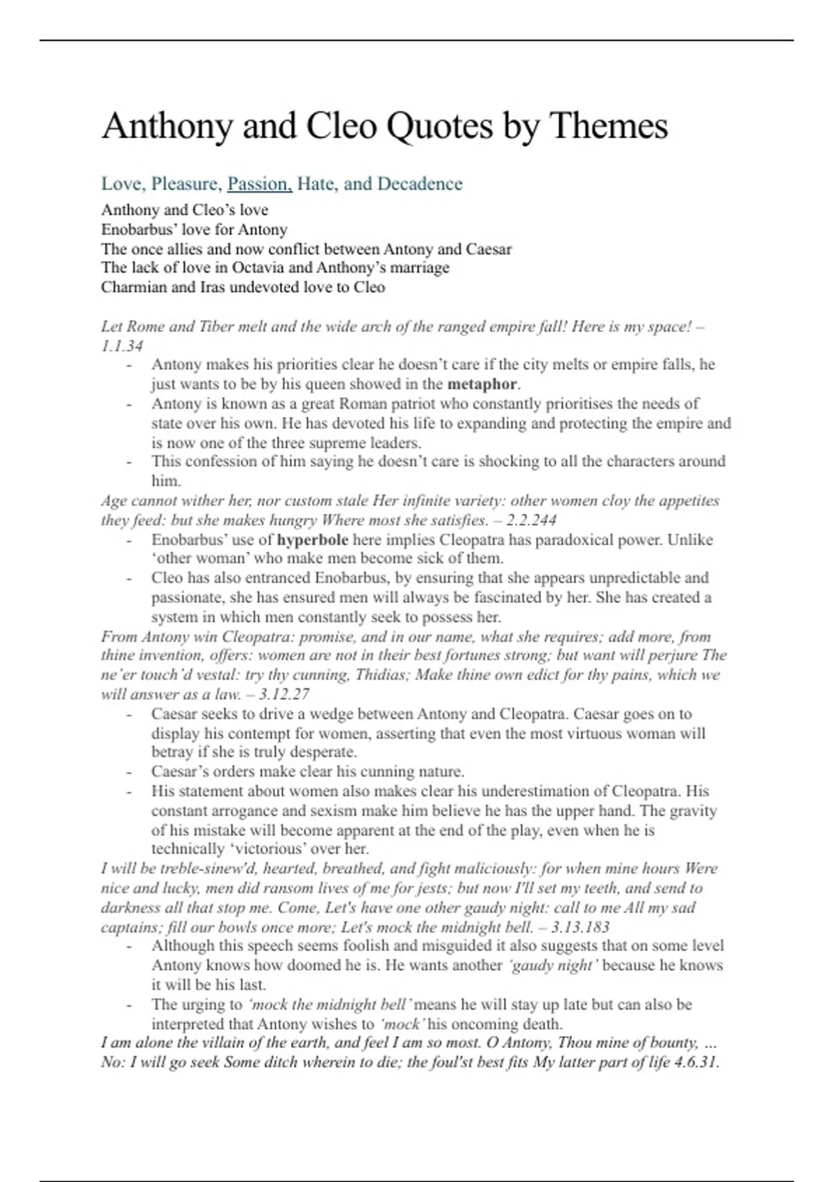 his document serves as a comprehensive analysis of William Shakespeare's "Antony and Cleopatra" through the lens of thematic exploration. Organized methodically, it delves into the intricacies of the play by dissecting notable quotes and providing insightful analysis, all arranged under distinct thematic categories. Each section within this document is meticulously crafted to illuminate the multifaceted nature of the characters, relationships, and overarching themes within "Antony and Cleopatra." By isolating key quotes and subjecting them to critical scrutiny, readers are offered a deeper understanding of Shakespeare's intentions and the complexities of the human condition as depicted in the play.